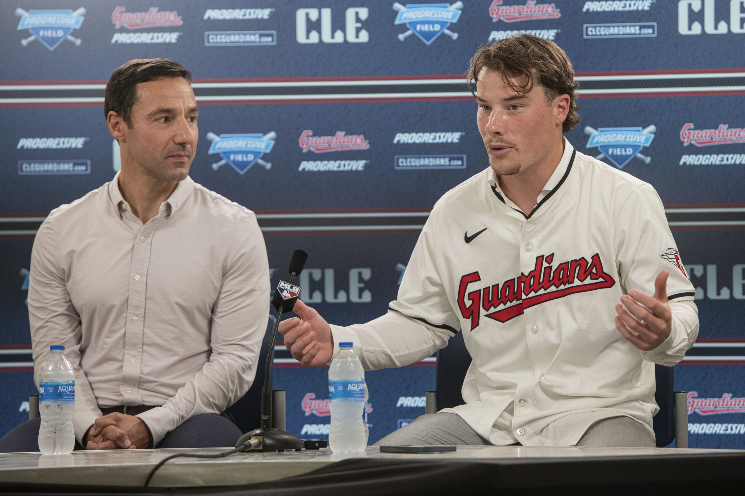 Photo: Cleveland Guardians first-round draft pick Travis Bazzana, right, of Australia, speaks at a news conference as Chris Antonetti, left, president of baseball operations, looks on before a baseball game against the San Diego Padres in Cleveland, Friday, July 19, 2024. (AP Photo/Phil Long)