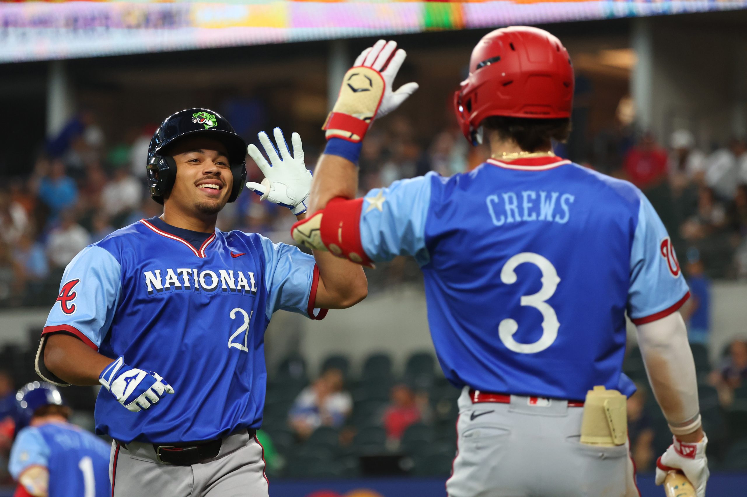 Photo Credit: Drake Baldwin #21 of the Atlanta Braves celebrates after hitting a solo home run with Dylan Crews #3 of the Washington Nationals during the sixth inning of the All-Star Futures Game at Globe Life Field on July 13, 2024 in Arlington, Texas. (Photo by Richard Rodriguez/Getty Images)