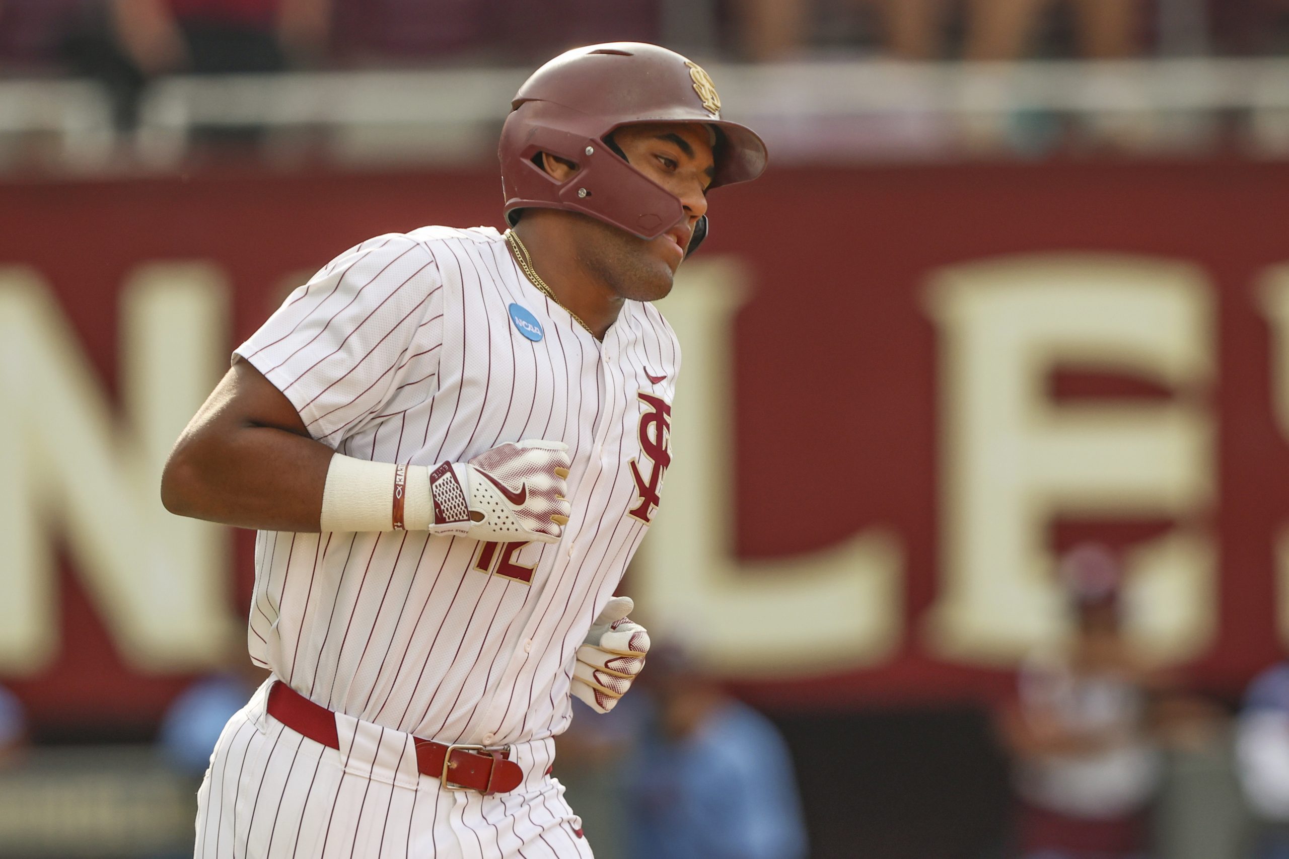 Photo: Myles Bailey (12) rounds first base hitting a homerun during an NCAA regional baseball game against Bethune Cookman on Friday, May 30, 2025, in Tallahassee, Fla. (AP Photo/Gary McCullough)
