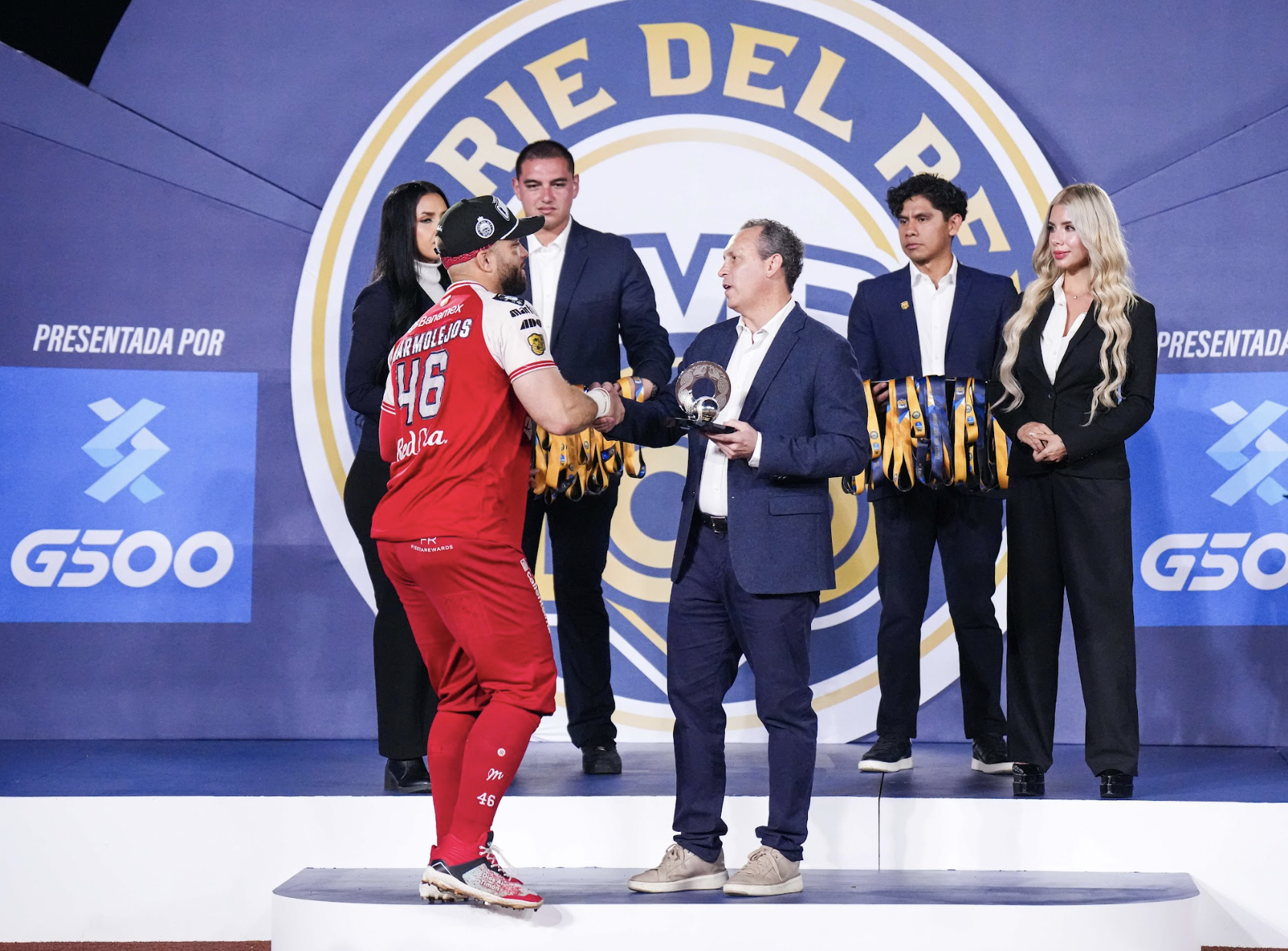 Photo: Jose Marmolejos of the Diablos Rojos del Mexico accepts the 2025 Serie del Rey MVP award from Liga Mexicana de Beisbol president Horacio de la Vega after game four at Estadio Panamericano in Zapopan, Jalisco, Mexico. (Photo courtesy of the Liga Mexicana de Beisbol)