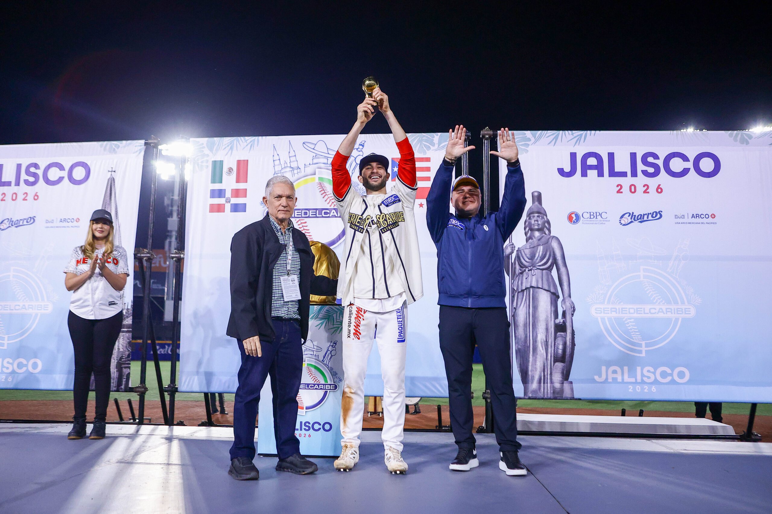 Photo: Michael Wielansky of the Charros de Jalisco holds the MVP trophy for the 2026 Caribbean Series. (Photo courtesy of the CBPC)