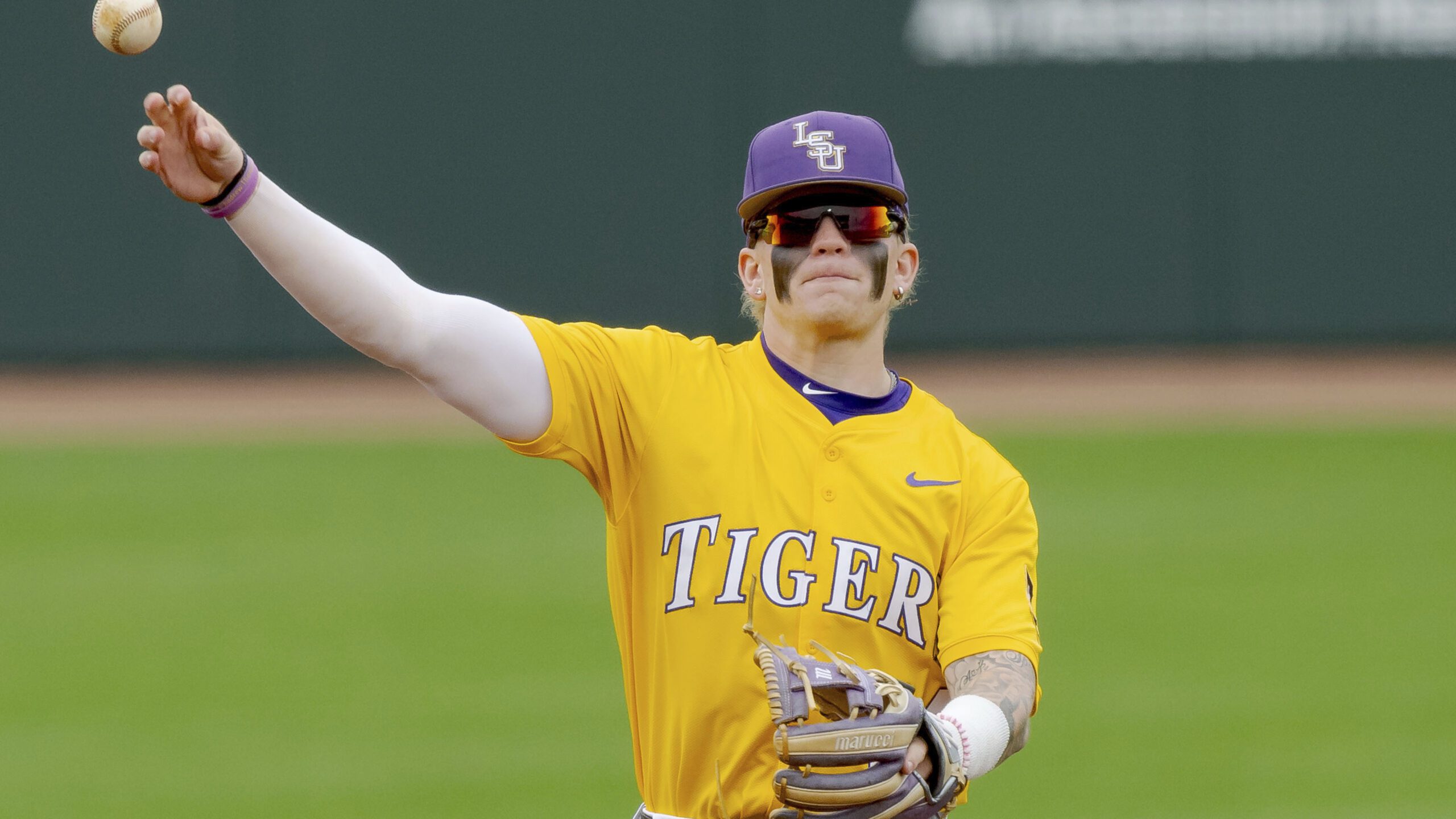 PHOTO: LSU infielder Daniel Dickinson (14) throws during an NCAA baseball game against North Alabama on Sunday, March 9, 2025, in Baton Rouge, La. (AP Photo/Matthew Hinton)