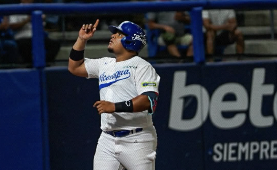 Photo: Omar Mendoza celebrates his solo homer in the second inning of Nicaragua’s exhibition series opener against Cuba in Leon, Nicaragua on Feb. 19. (Photo via FENIBA on Facebook)