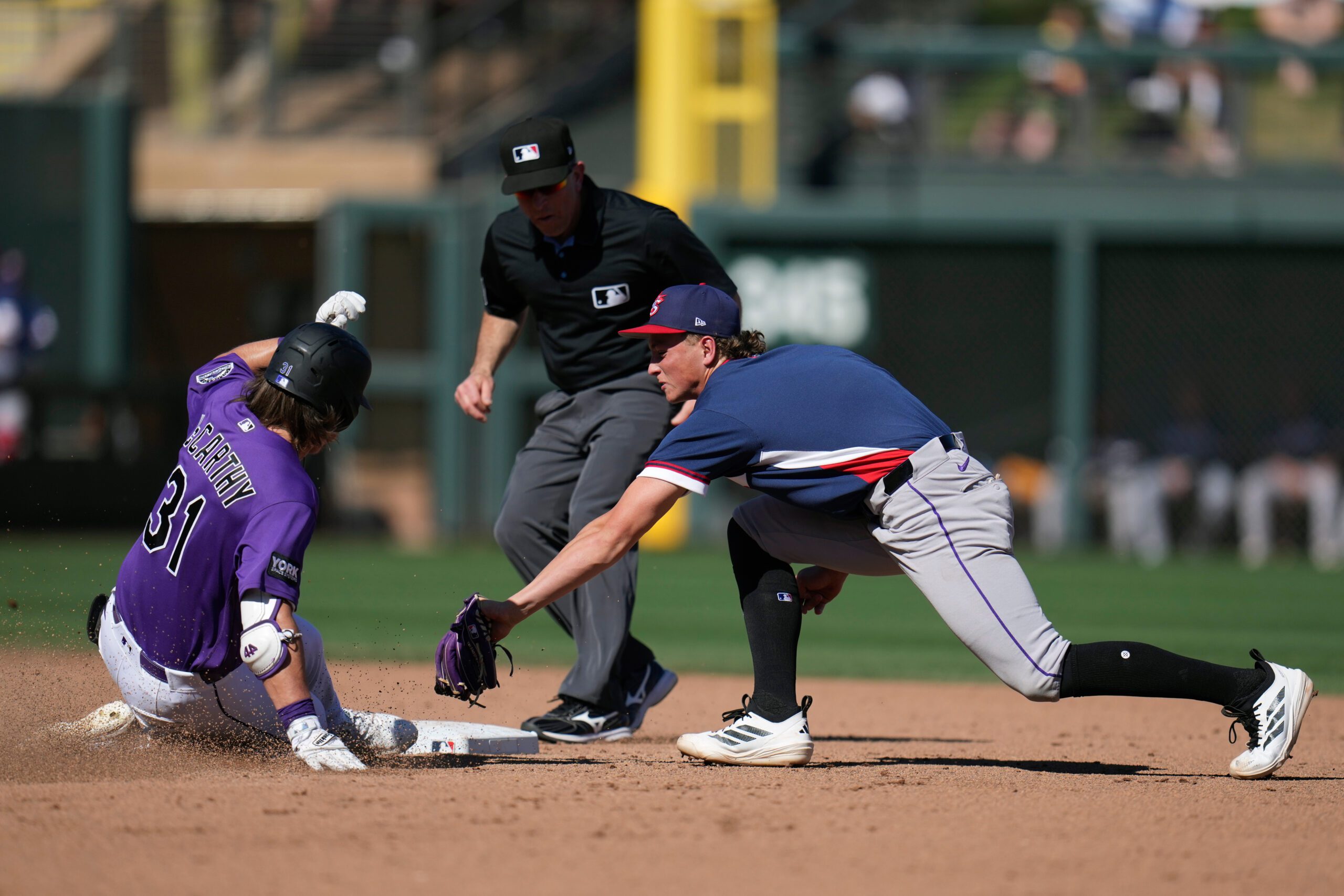 Photo: Colorado Rockies’ Jake McCarthy (31) slides safely into second base with a double as United States shortstop Ethan Holliday applies a late tag during the fifth inning of an exhibition baseball game Wednesday, March 4, 2026, in Scottsdale, Ariz. (AP Photo/Ross D. Franklin)