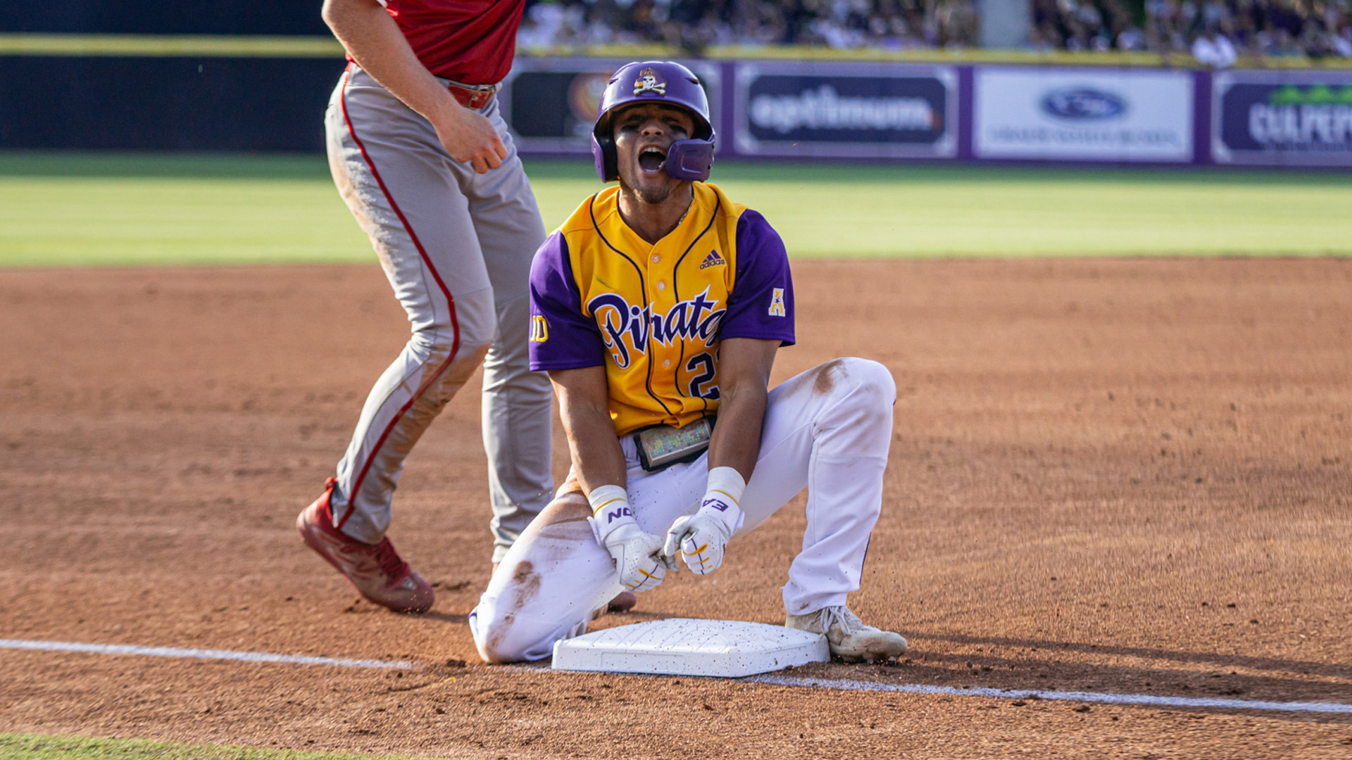 In the bottom of the fifth inning, ECU finally got on the scoreboard with designated hitter Ryan McCrystal slugging a double to left field, scoring shortstop Joey Berini to tie the game at 1-1.