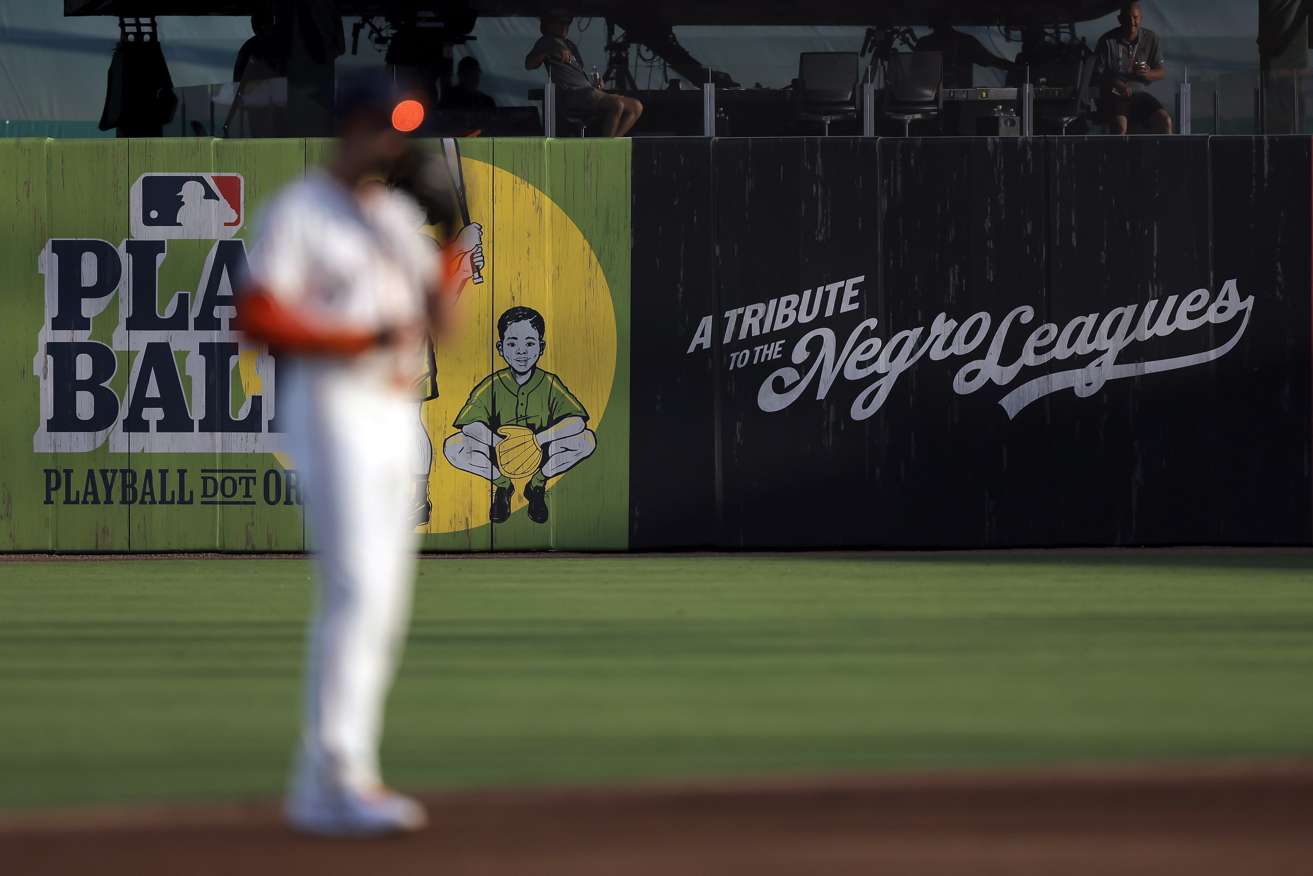 Photo Credit: Nick Ahmed (16) walks in front of signage honoring the Negro Leagues during the game between the San Francisco Giants and St. Louis Cardinals at historic Rickwood Field in Birmingham, Ala. (Photo by Carlos Avila Gonzalez/San Francisco Chronicle via Getty Images)