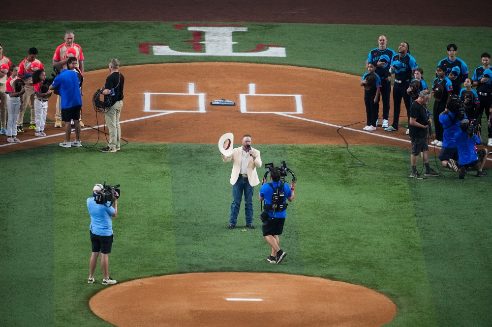 Johnson walked toward the microphone between the mound and home plate at the home of the Texas Rangers on Tuesday night wearing a white cowboy hat and cream-colored blazer. The 37-year-old Texan removed the hat just before he started singing and raised it in his right hand several times along the way.