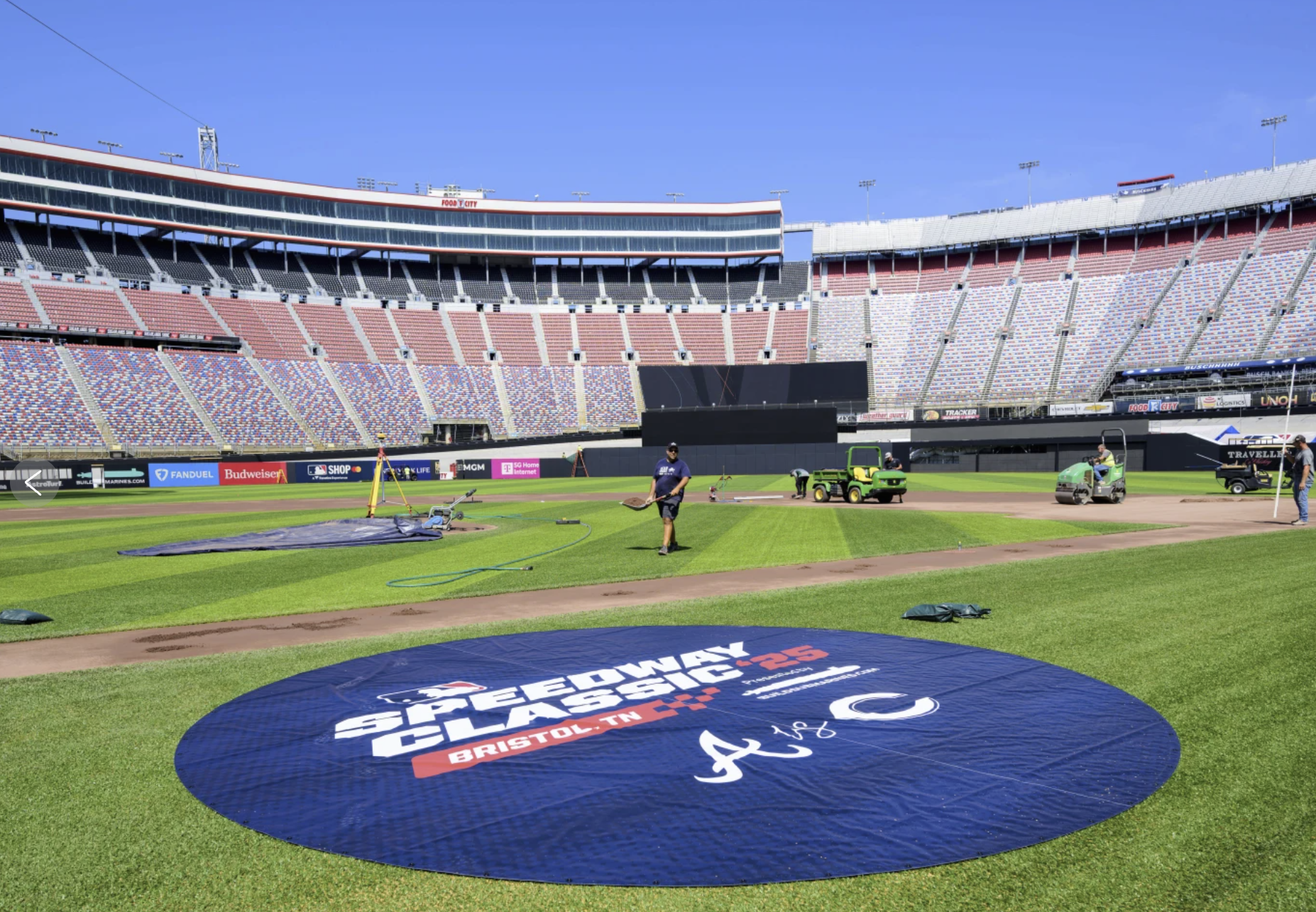 Photo: Work continues on the baseball field inside the racetrack at Bristol Motor Speedway, Friday, July 25, 2025, in Bristol, Tenn., for MLB Speedway Classic baseball game between the Cincinnati Reds and Atlanta Braves on Aug.2 (Earl Neikirk/Bristol Motor Speedway via AP)