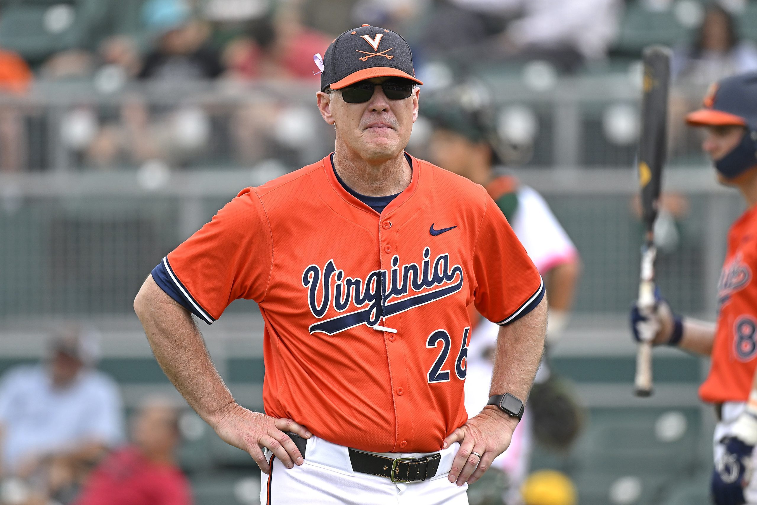 Photo Credit: Virginia head coach Brian O’Connor waits while umpires discuss a challenged call. (Photo by Samuel Lewis/Icon Sportswire via Getty Images)