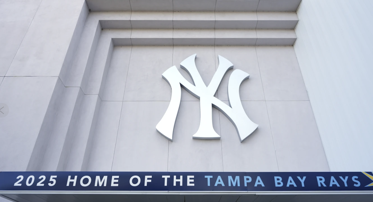 “New York Yankees executive offices” was etched in the doors of an office entrance and the statue of late Yankees owner George Steinbrenner and the display of New York’s retired numbers outside the ballpark remained unaltered. Yankees logos were in place at the end of each row in the seating bowl and while “TB” replaced a Yankees sign atop the scoreboard, the letters “George M. Steinbrenner Field” remained underneath.