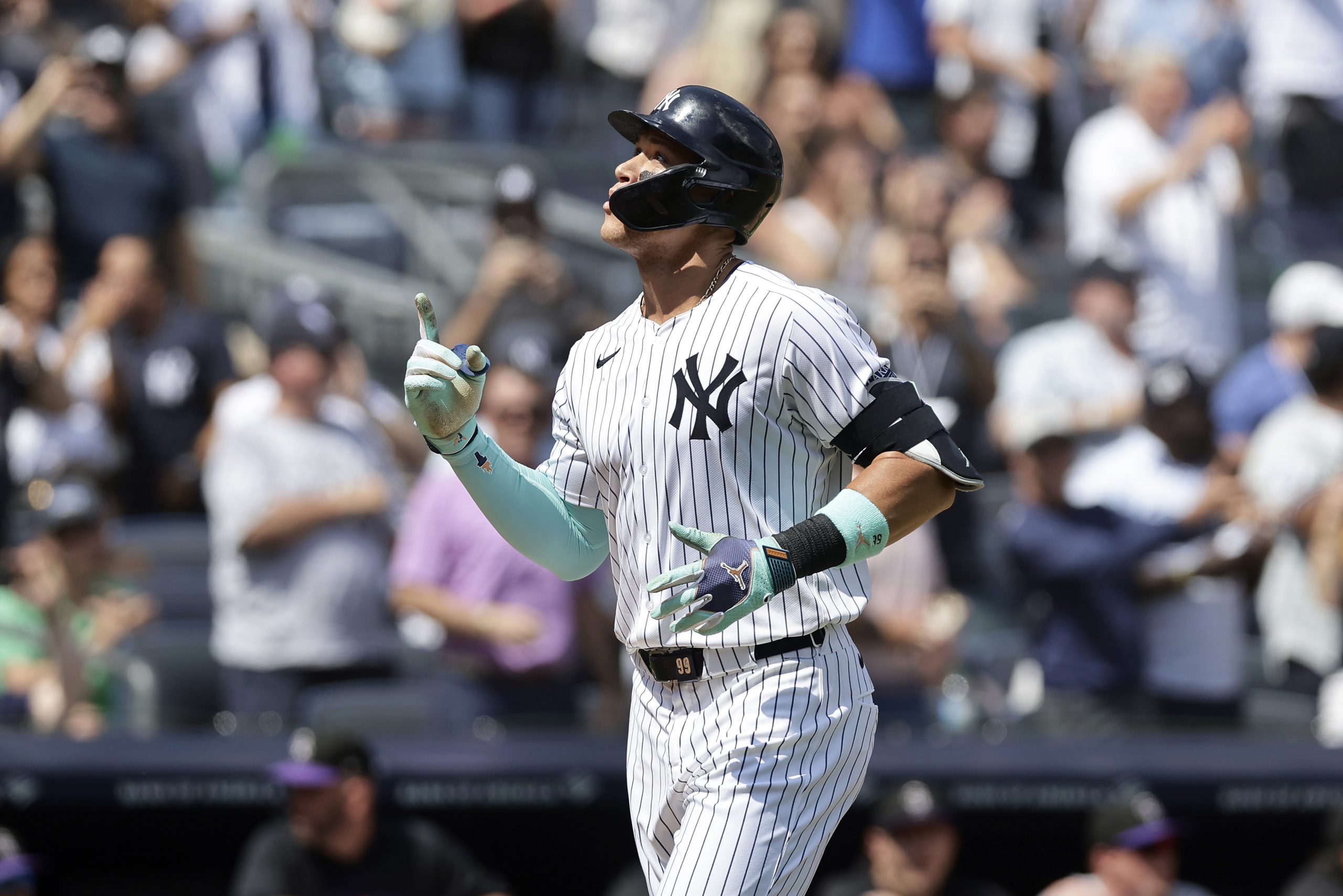 Photo Credit: Aaron Judge #99 of the New York Yankees gestures as he runs the bases after his first inning two run home run against the Colorado Rockies at Yankee Stadium on August 25, 2024 in New York City. The home run was Judge’s 50th of the season. (Photo by Jim McIsaac/Getty Images)