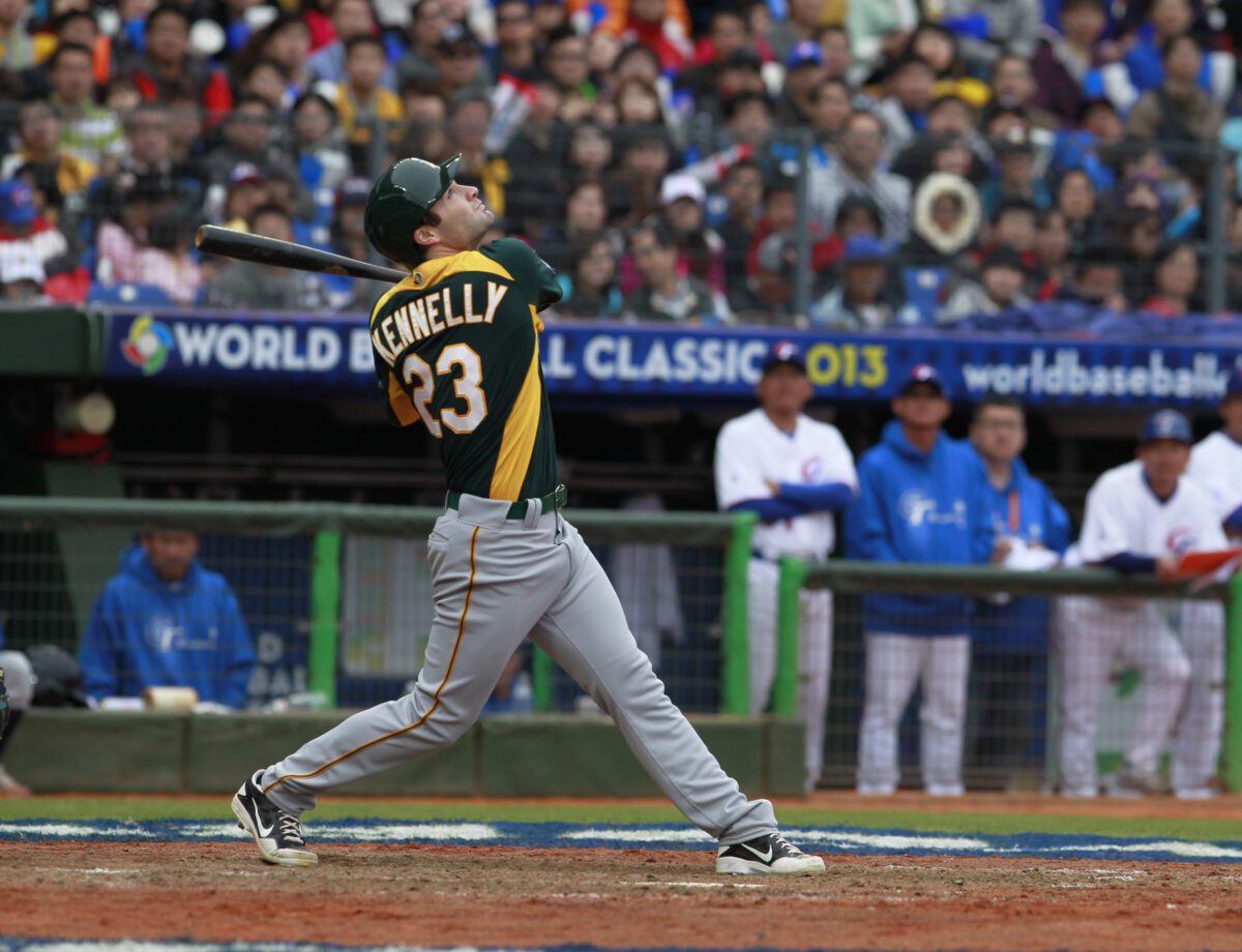 Photo: Tim Kennelly (23) follows his pop fly against Taiwan in the eighth inning of their World Baseball Classic first round game at the Intercontinental Baseball Stadium in Taichung, Taiwan, Saturday, March 2, 2013. (AP Photo/Wally Santana)