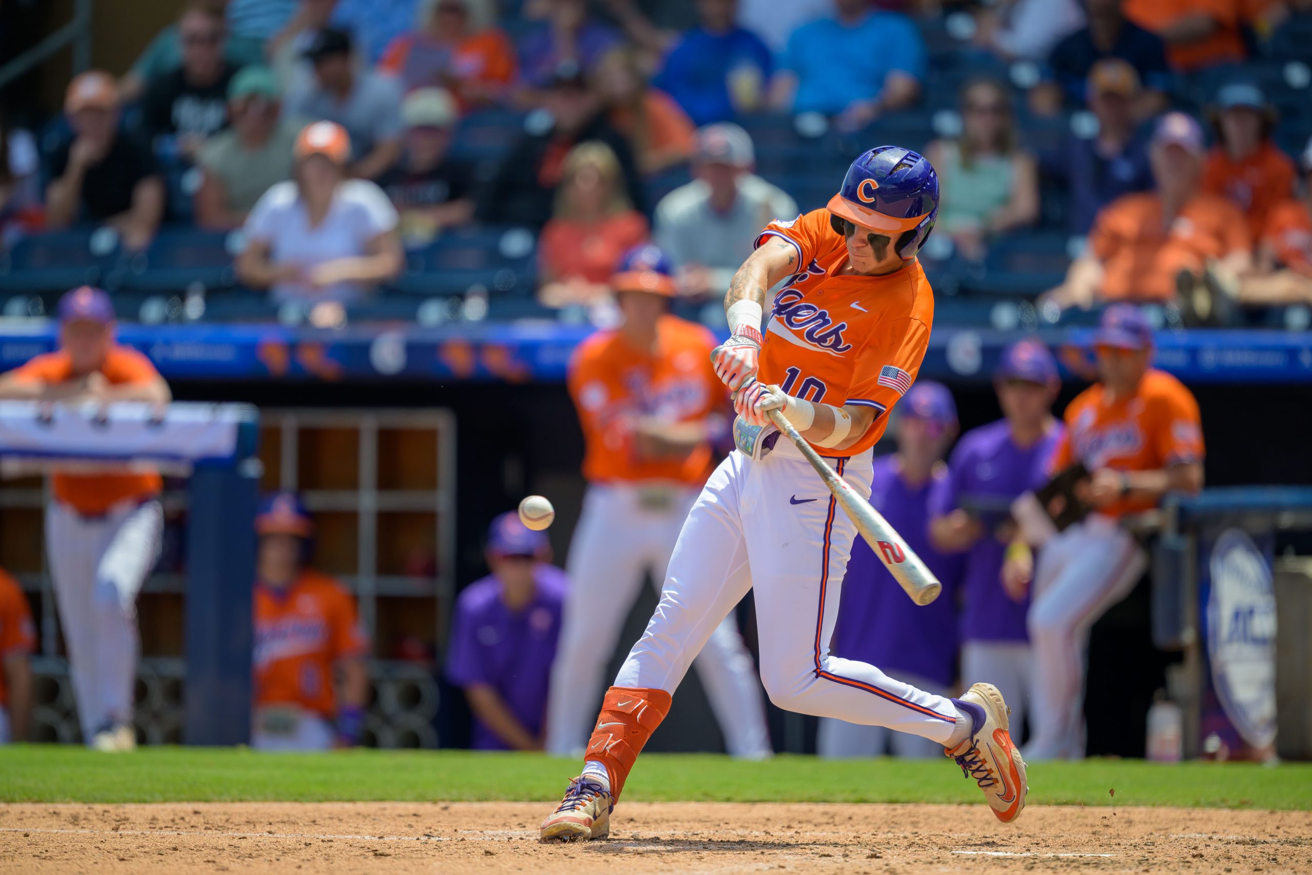 Photo: Cam Cannarella hits a single to drive in Andrew Ciufo in the seventh inning of the Clemson Tigers 9-4 win against Georgia Tech in the ACC semifinal. (Photo courtesy of the ACC)