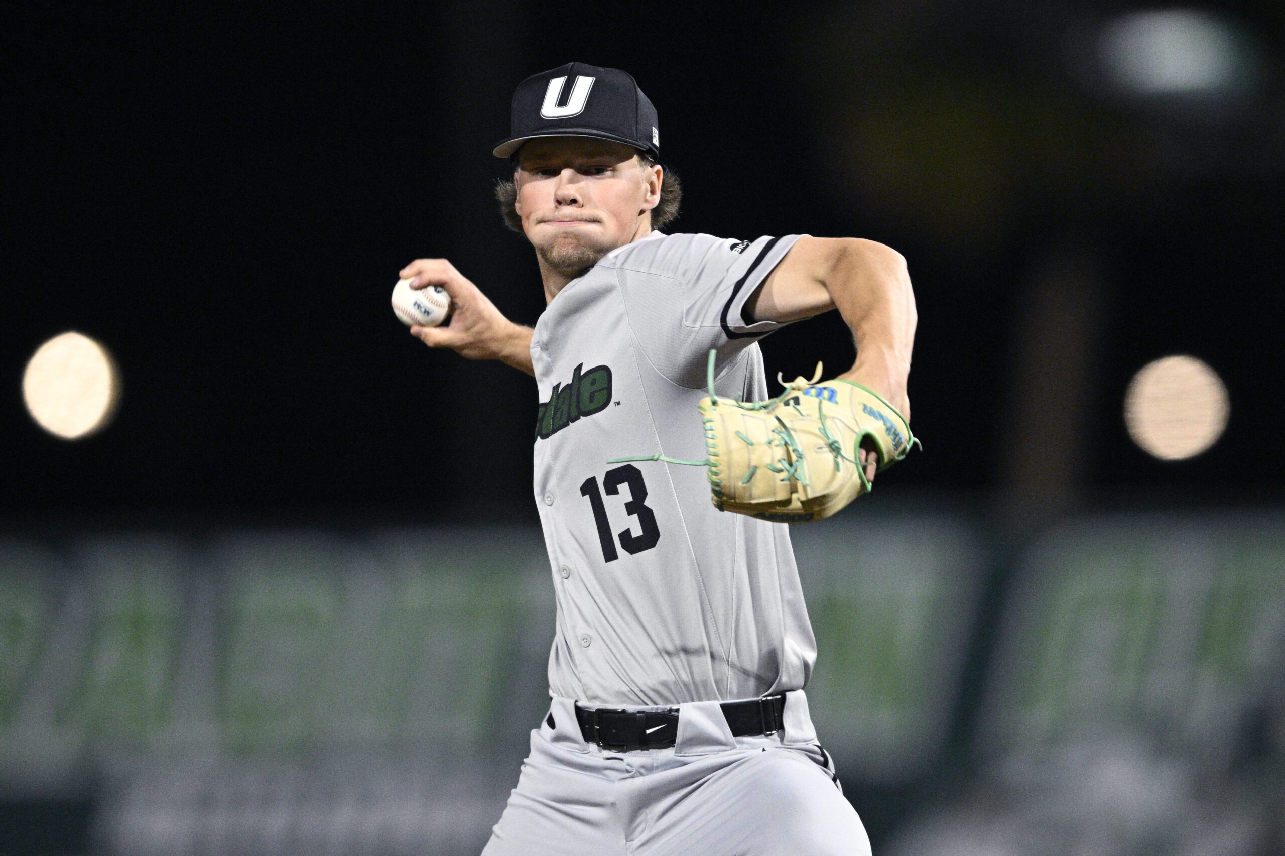 PHOTO: USC Upstate pitcher Amp Phillips (13) throws during an NCAA college baseball game against Stetson, Tuesday, March 11, 2025, in DeLand, Fla. (AP Photo/Phelan M. Ebenhack)