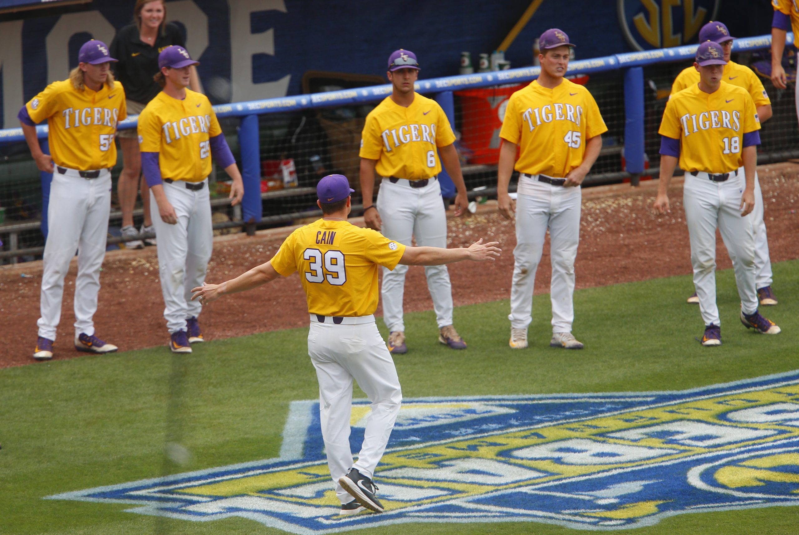Photo Credit: LSU assistant coach Nolan Cain holds back players as they clear the dugout after a play during the fourth inning of the championship game against Arkansas in the Southeastern Conference NCAA college baseball tournament, Sunday, May 28, 2017, in Hoover, Ala. (AP Photo/Butch Dill)