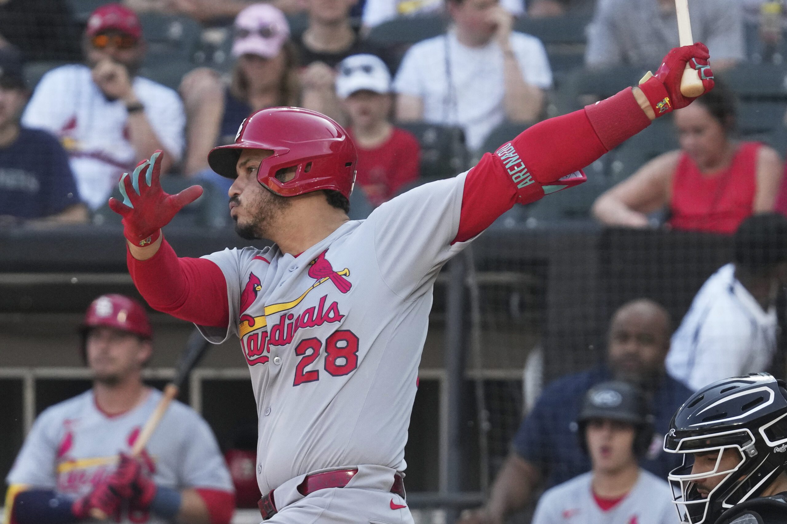 Photo: St. Louis Cardinals’ Nolan Arenado swings strikes out swinging during the first inning in the second baseball game of a doubleheader against the Chicago White Sox, Thursday, June 19, 2025. (AP Photo/Nam Y. Huh)