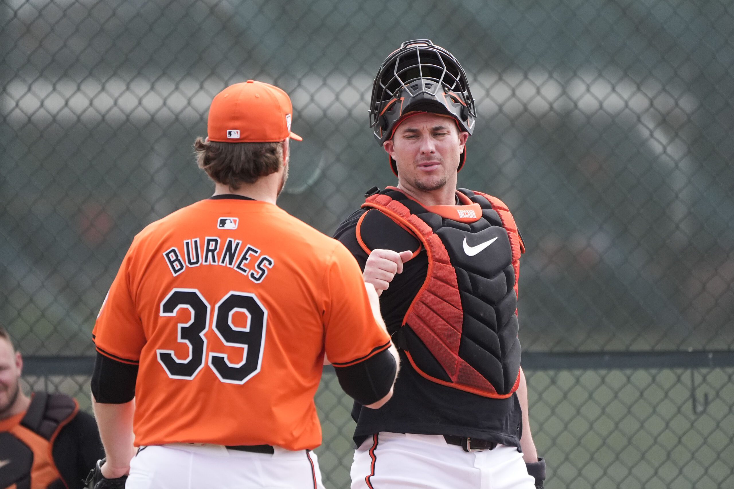 Photo: Baltimore Orioles pitcher Corbin Burnes (39) greets catcher James McCann after warming up in the bullpen during spring training in Sarasota, Fla., Saturday, Feb. 17, 2024. (AP Photo/Gerald Herbert)