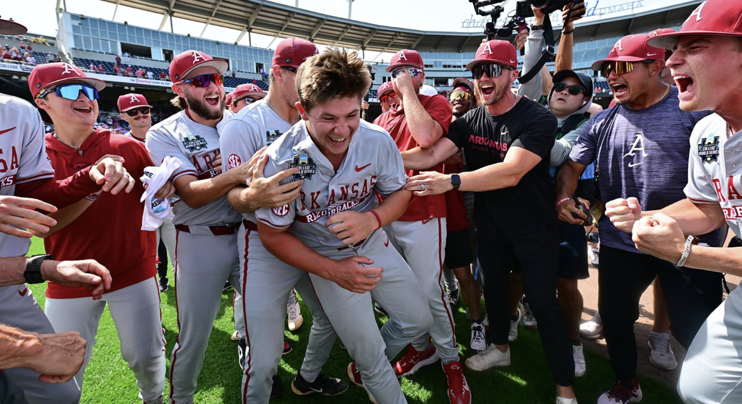Photo: The Arkansas Razorbacks mob starting pitcher Gage Wood, who threw the third no-hitter in Men’s College World Series history in a 3-0 win over the Murray State Racers on June 16, 2025. (Photo via @RazorbacksBSB on X)