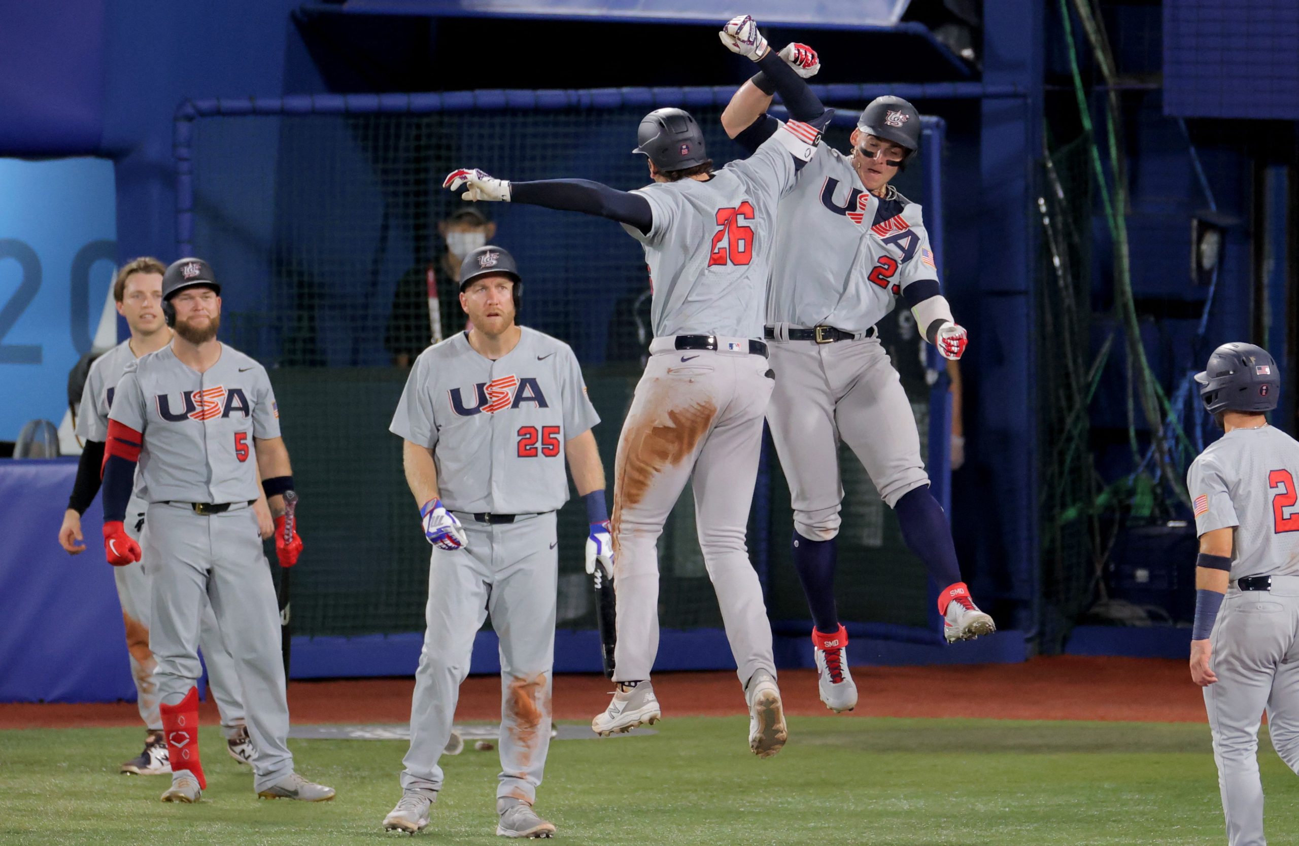 Photo Credit: USA’s Triston Casas (3rd R) jumps to celebrate his three run home run during the fifth inning of the Tokyo 2020 Olympic Games baseball round 2 game between USA and Japan at Yokohama Baseball Stadium in Yokohama, Japan, on August 2, 2021. (Photo by KAZUHIRO FUJIHARA / AFP) (Photo by KAZUHIRO FUJIHARA/AFP via Getty Images)