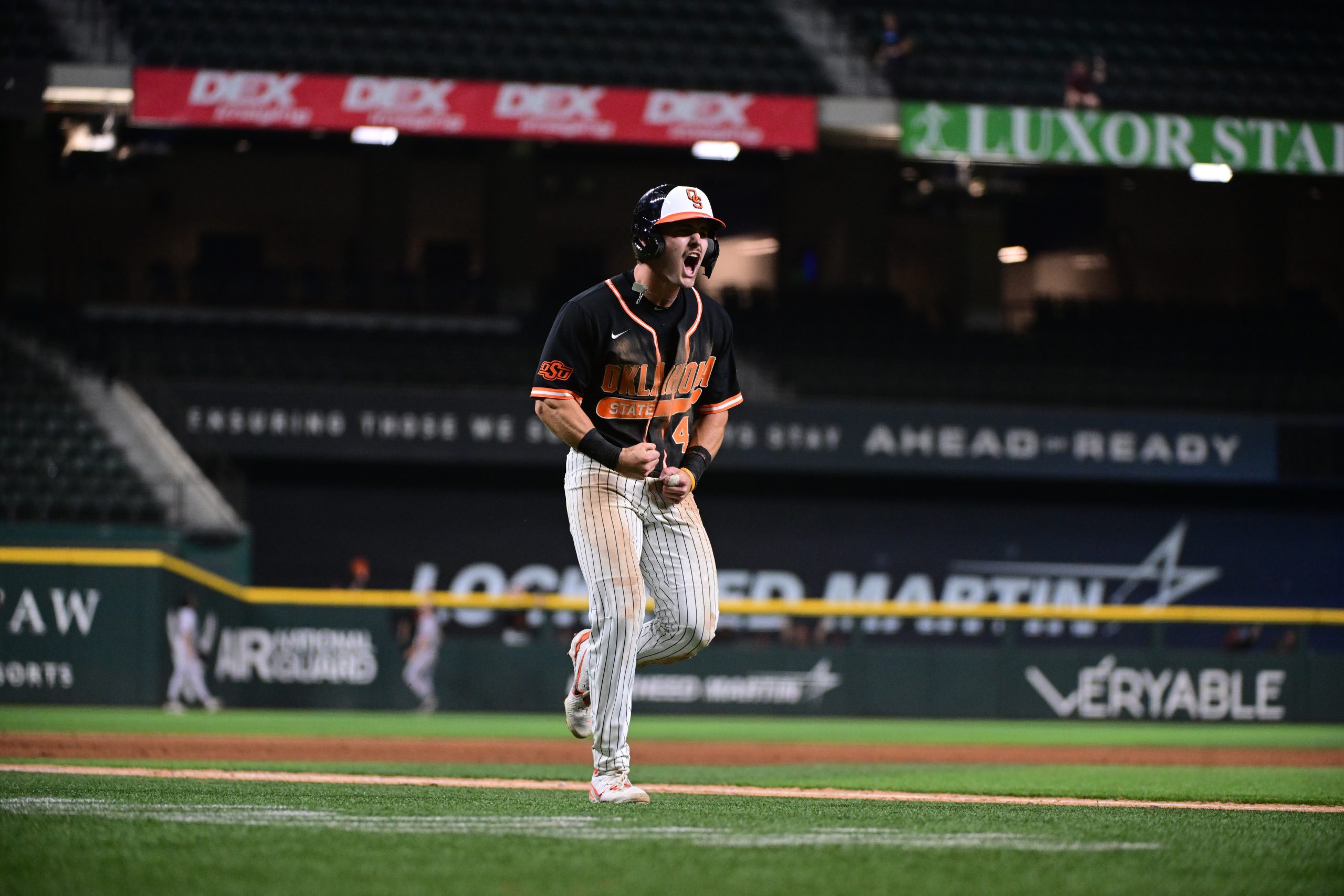 Arlington, Texas – In the second elimination game on Friday at Globe Life Field, the No. 2 seed Oklahoma State University Cowboys knocked off the No. 10 Texas Tech University Red Raiders with a 4-0 shutout win.