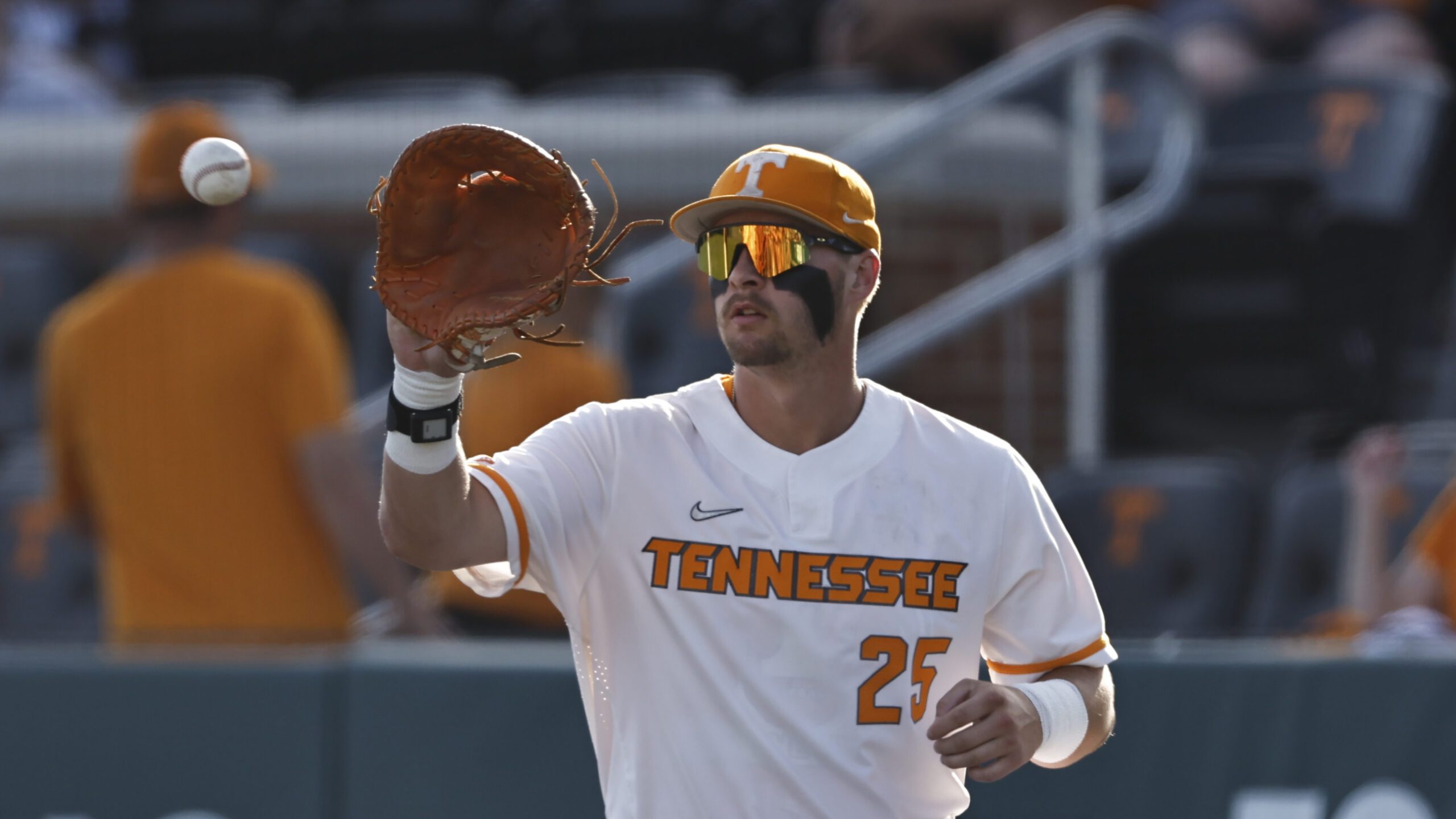 PHOTO: Tennessee first baseman Blake Burke (25) catches a throw during an NCAA regional baseball game against Northern Kentucky on Friday, May 31, 2024, in Knoxville, Tenn. (AP Photo/Wade Payne)