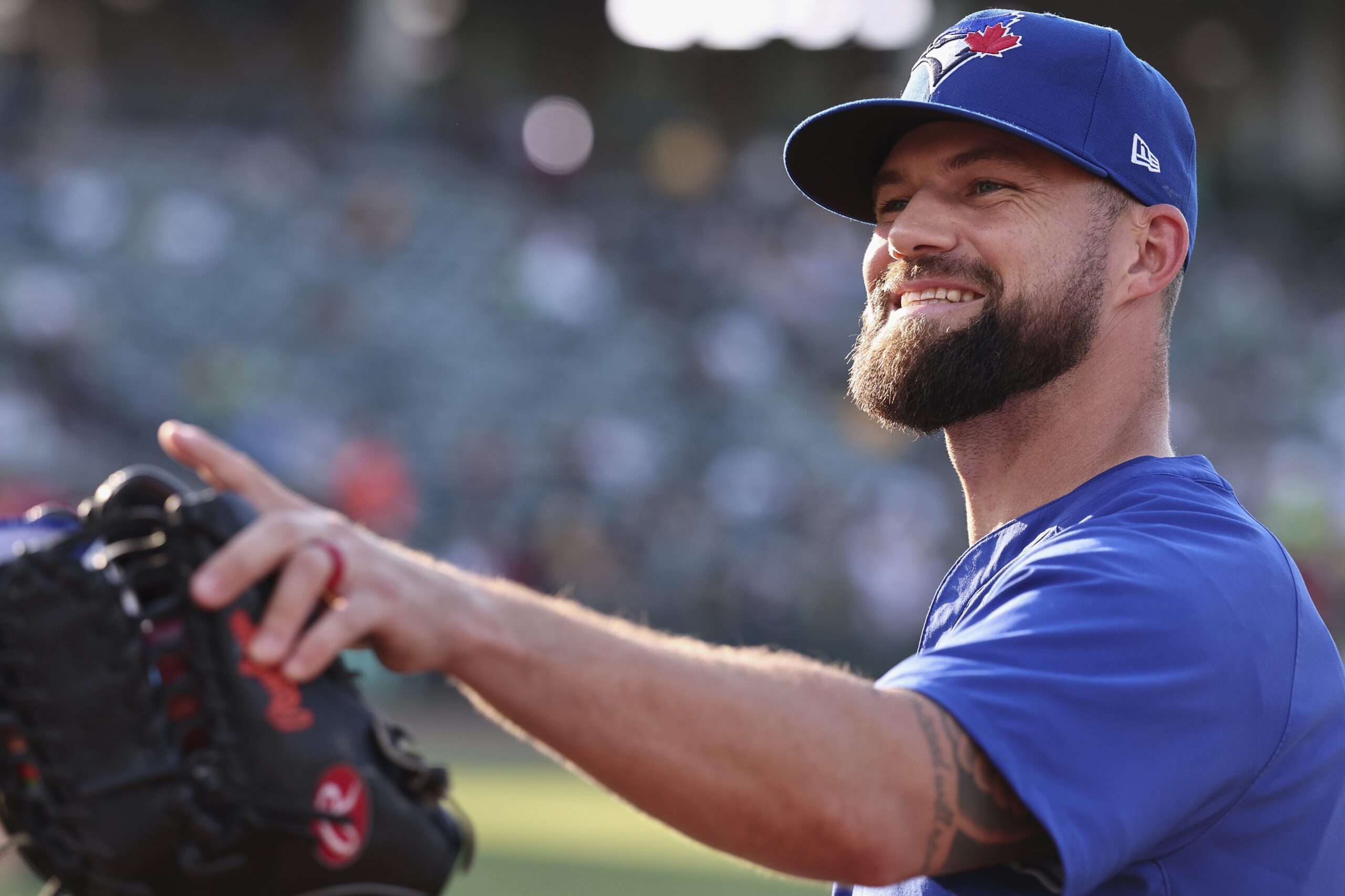 Photo: Toronto Blue Jays outfielder Nathan Lukes says hi to fans before a baseball game against the Athletics Saturday, July 12, 2025, in West Sacramento, Calif. (AP Photo/Sara Nevis)