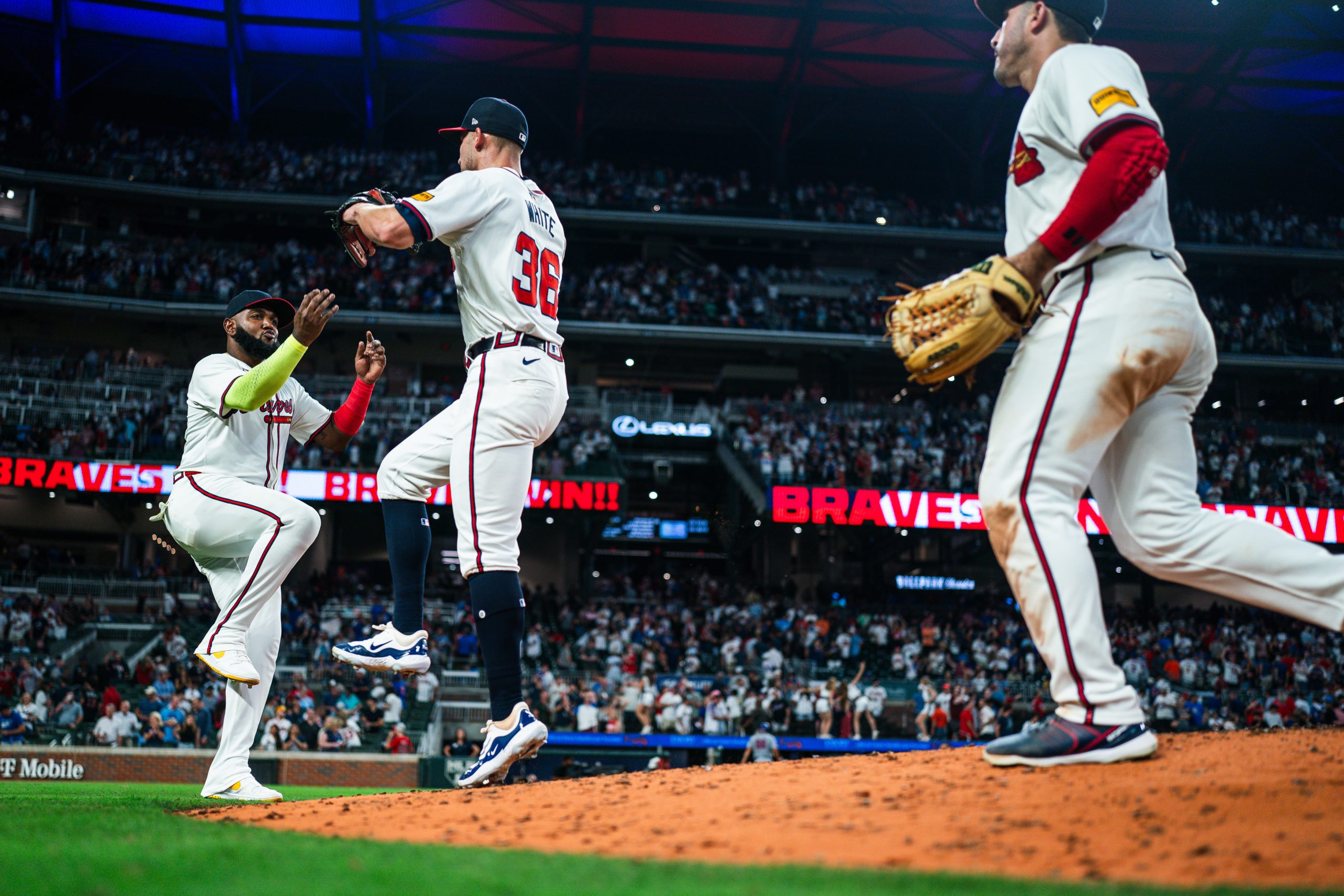 Photo Credit: Marcell Ozuna #20 and Eli White #36 of the Atlanta Braves celebrate after defeating the New York Mets at Truist Park on September 24, 2024 in Atlanta, Georgia. (Photo by Kevin D. Liles/Atlanta Braves/Getty Images)