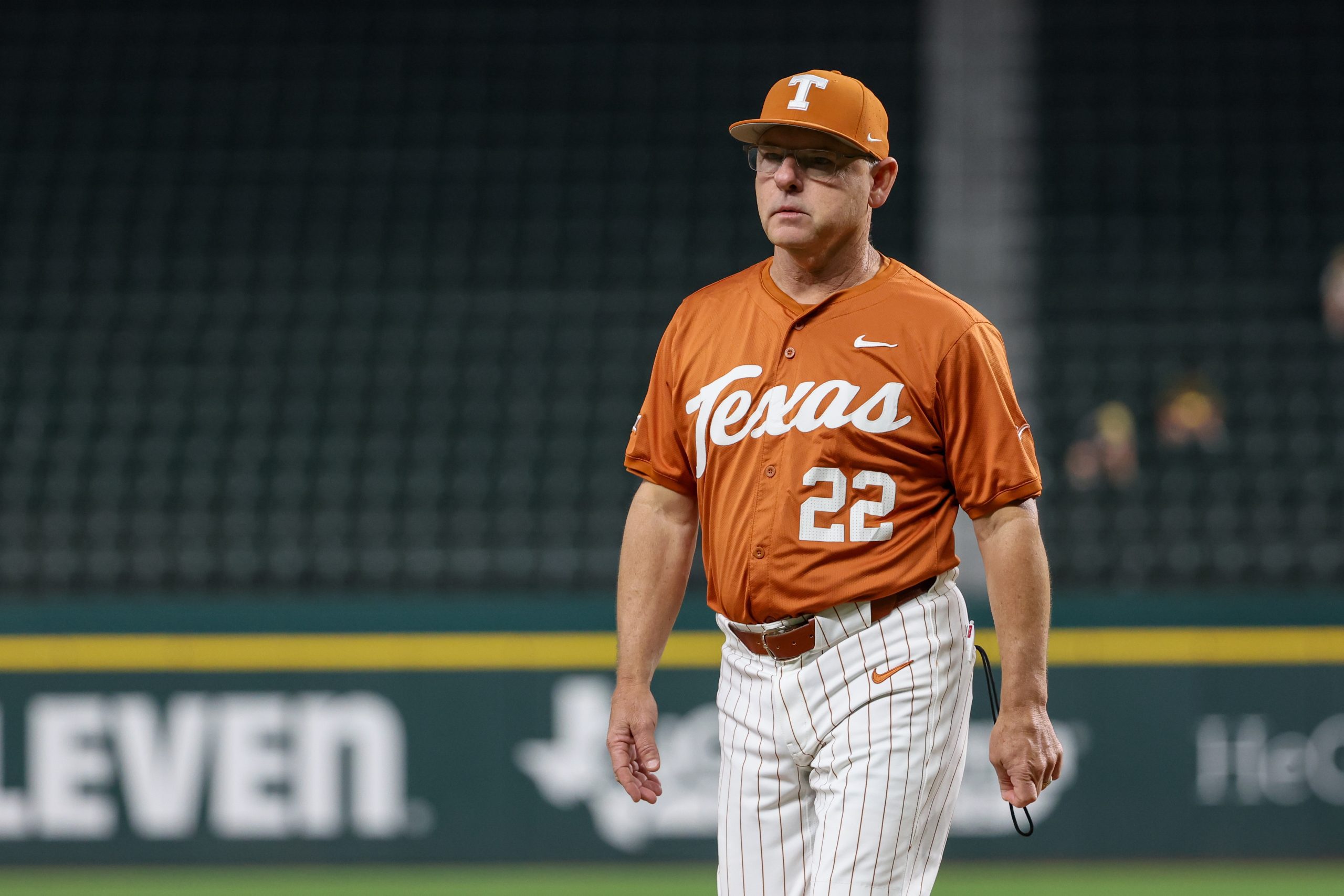Photo Credit: Texas head coach David Pierce walks off the field after talking to the pitcher. (Photo by David Buono/Icon Sportswire via Getty Images)