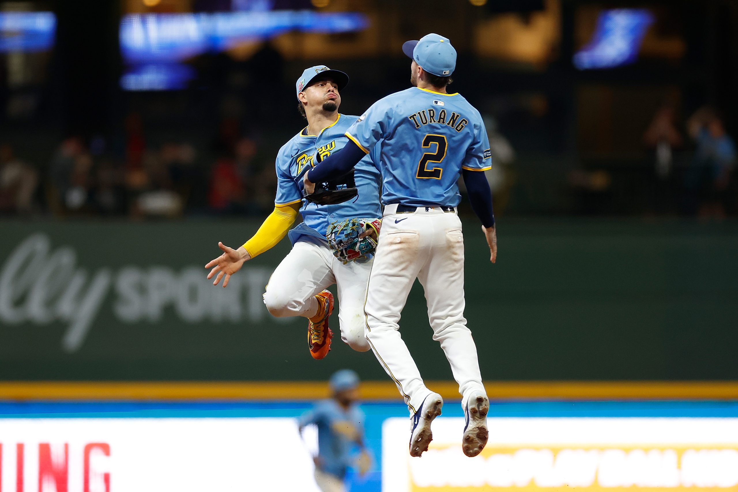 Photo Credit: Willy Adames #27 of the Milwaukee Brewers celebrates with Brice Turang #2 a 5-3 win over the Cleveland Guardians at American Family Field on August 16, 2024 in Milwaukee, Wisconsin. (Photo by John Fisher/Getty Images)