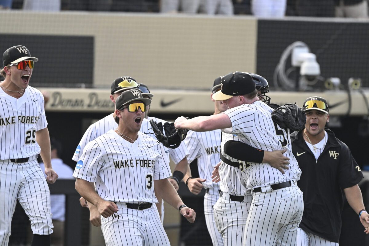PHOTO: Wake Forest celebrates after winning an NCAA college baseball tournament super regional game against Alabama on Saturday, June 10, 2023, in Winston-Salem, N.C. (AP Photo/Matt Kelley)