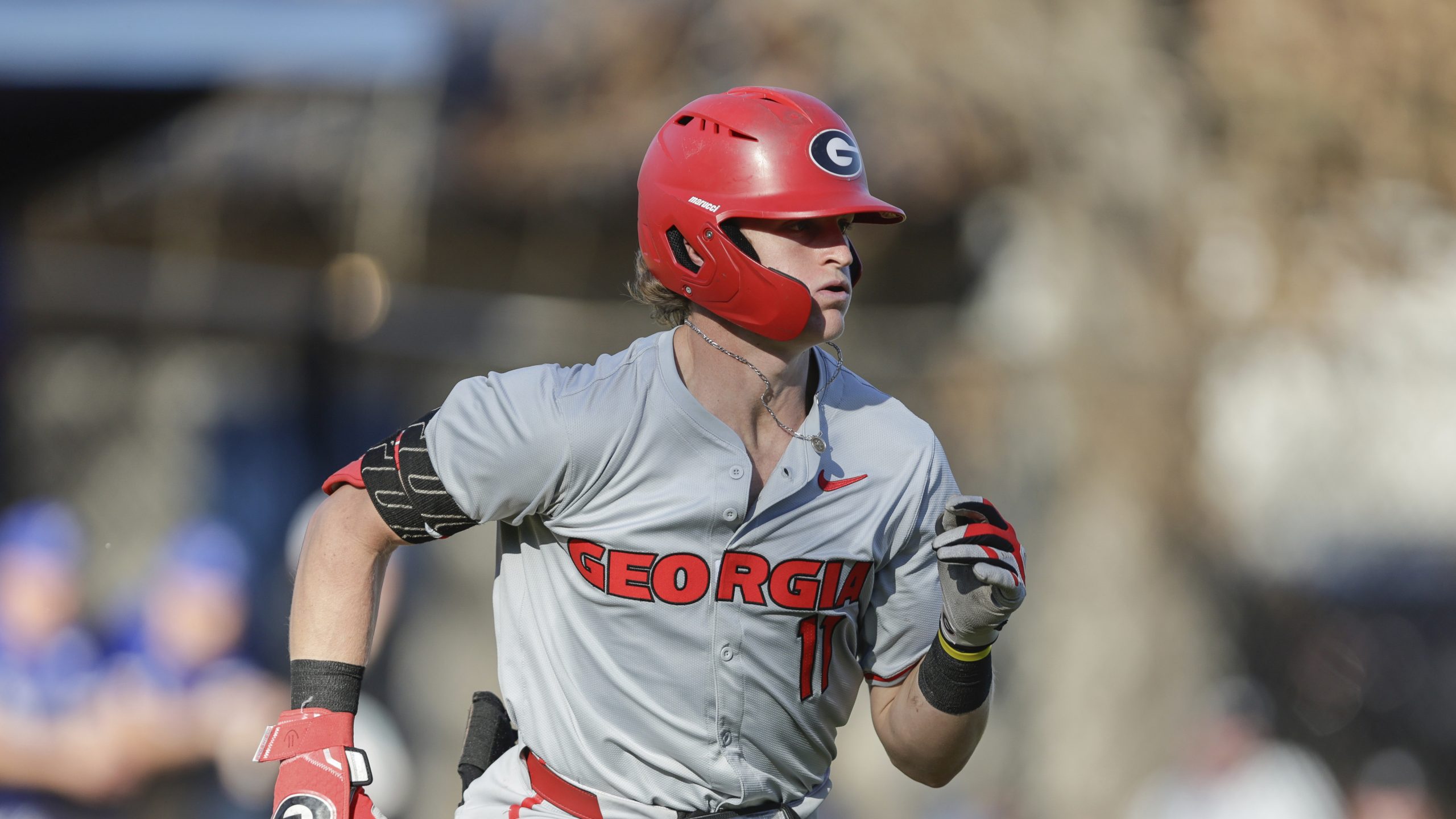 Caption: Georgia’s Henry Hunter (11) runs to first base during an NCAA baseball game against Georgia State on Wednesday, Feb. 26, 2025 in Atlanta, Ga. (AP Photo/Stew Milne)