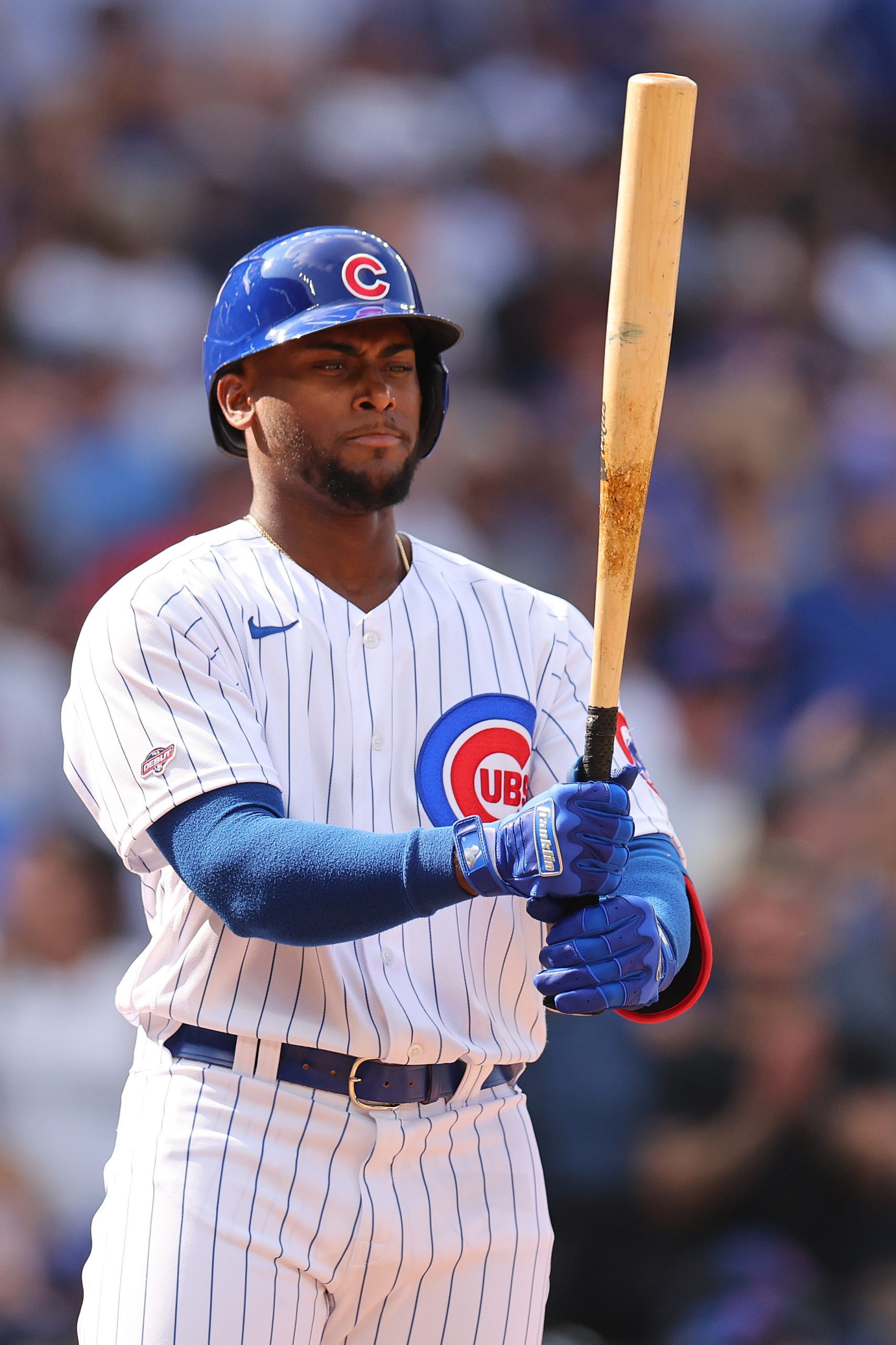 Alexander Canario #4 of the Chicago Cubs at bat during his MLB debut. (Photo by Michael Reaves/Getty Images)