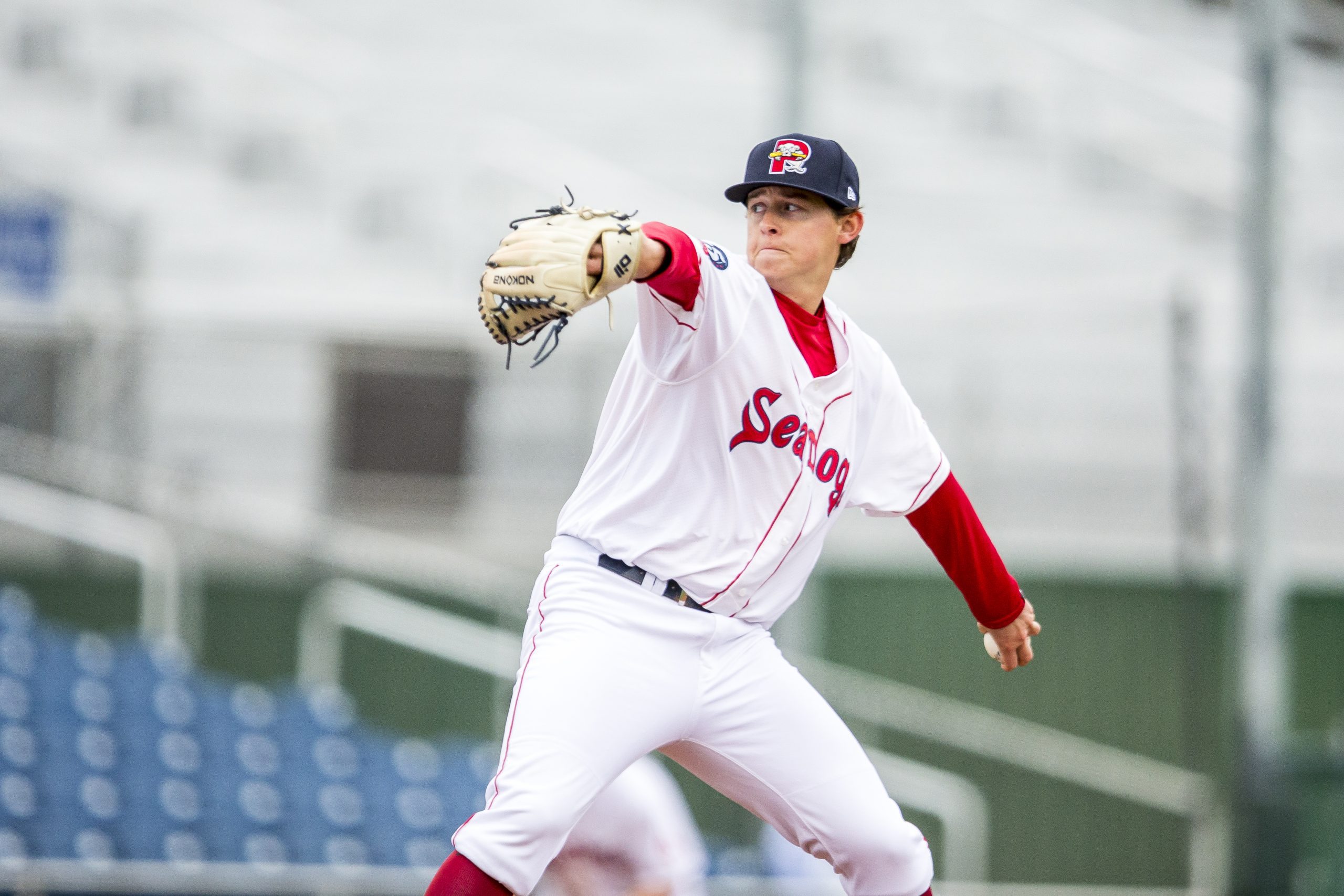 Matthew Kent #21 of the Portland Sea Dogs delivers in a game. (Photo by Zachary Roy/Getty Images)
