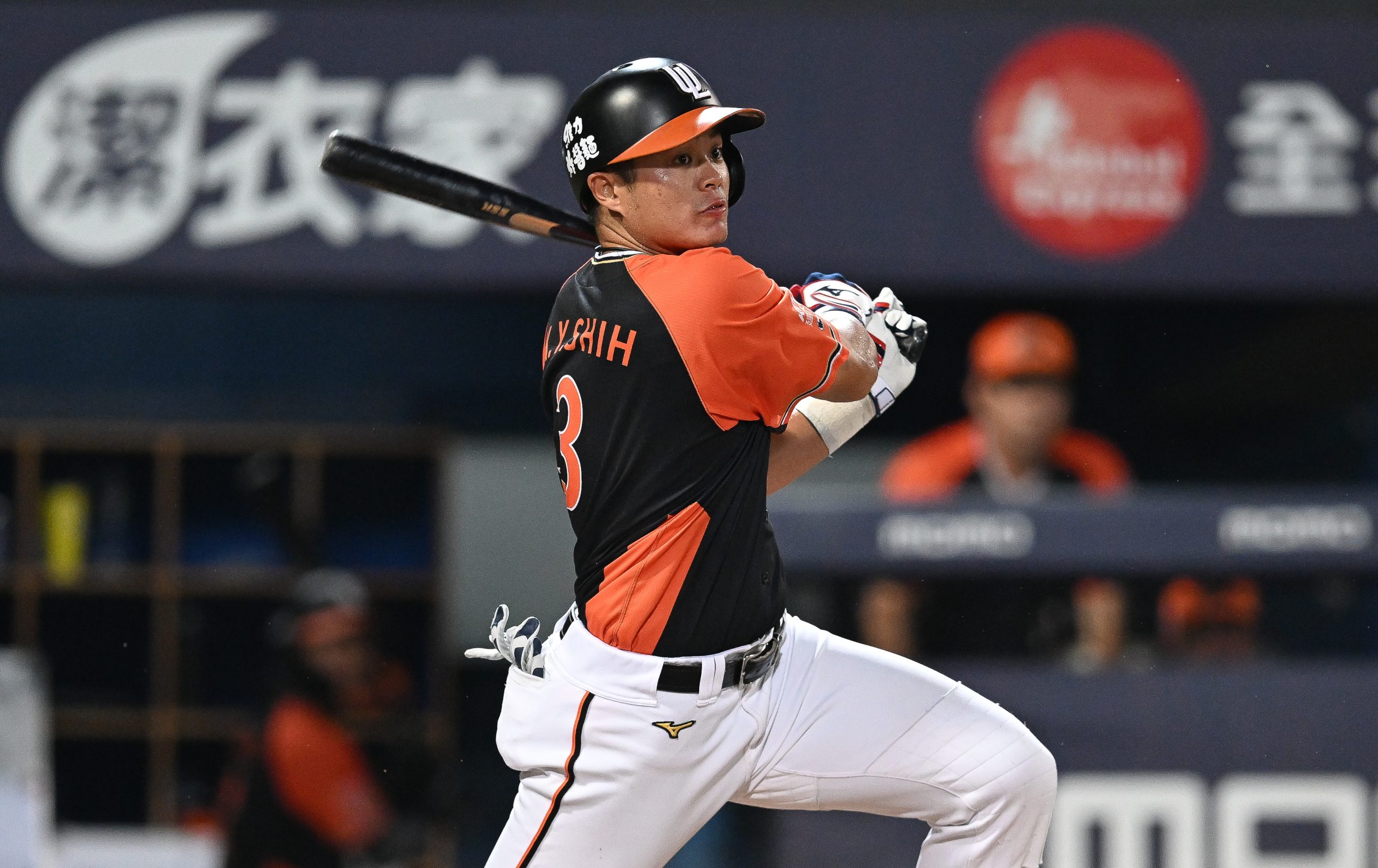 Photo Credit: Kuan Yu Shih #3 of Uni-Lions hits a single in the top of the fourth inning during the CPBL game between Uni-Lions and Fubon Guardians. (Photo by Gene Wang/Getty Images)