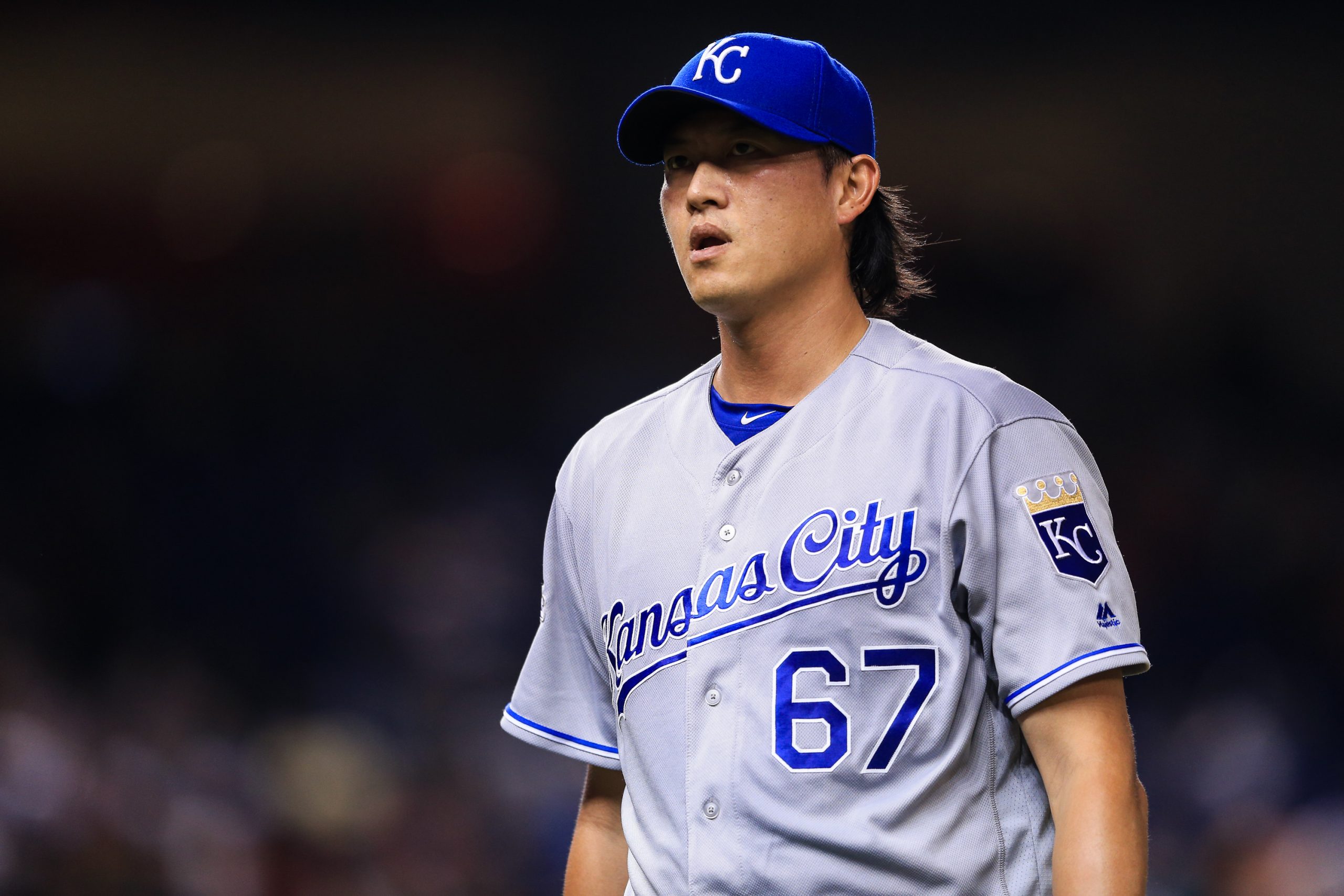 Chien-Ming Wang #67 of the Kansas City Royals looks on during the game against the Miami Marlins at Marlins Park on August 24, 2016, in Miami, Florida. (Photo by Rob Foldy/Getty Images)