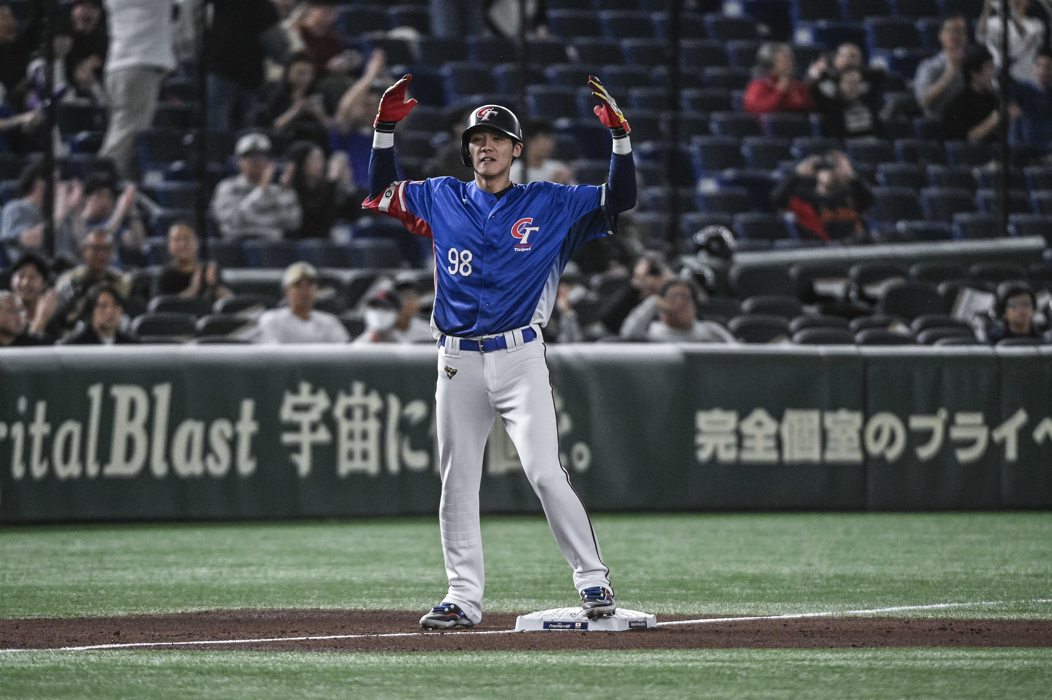 Photo: Chen Chen-Wei of Chinese Taipei celebrates a triple against the United States at the 2024 WBSC Premier12 at the Tokyo Dome. (Photo Courtesy WBSC)