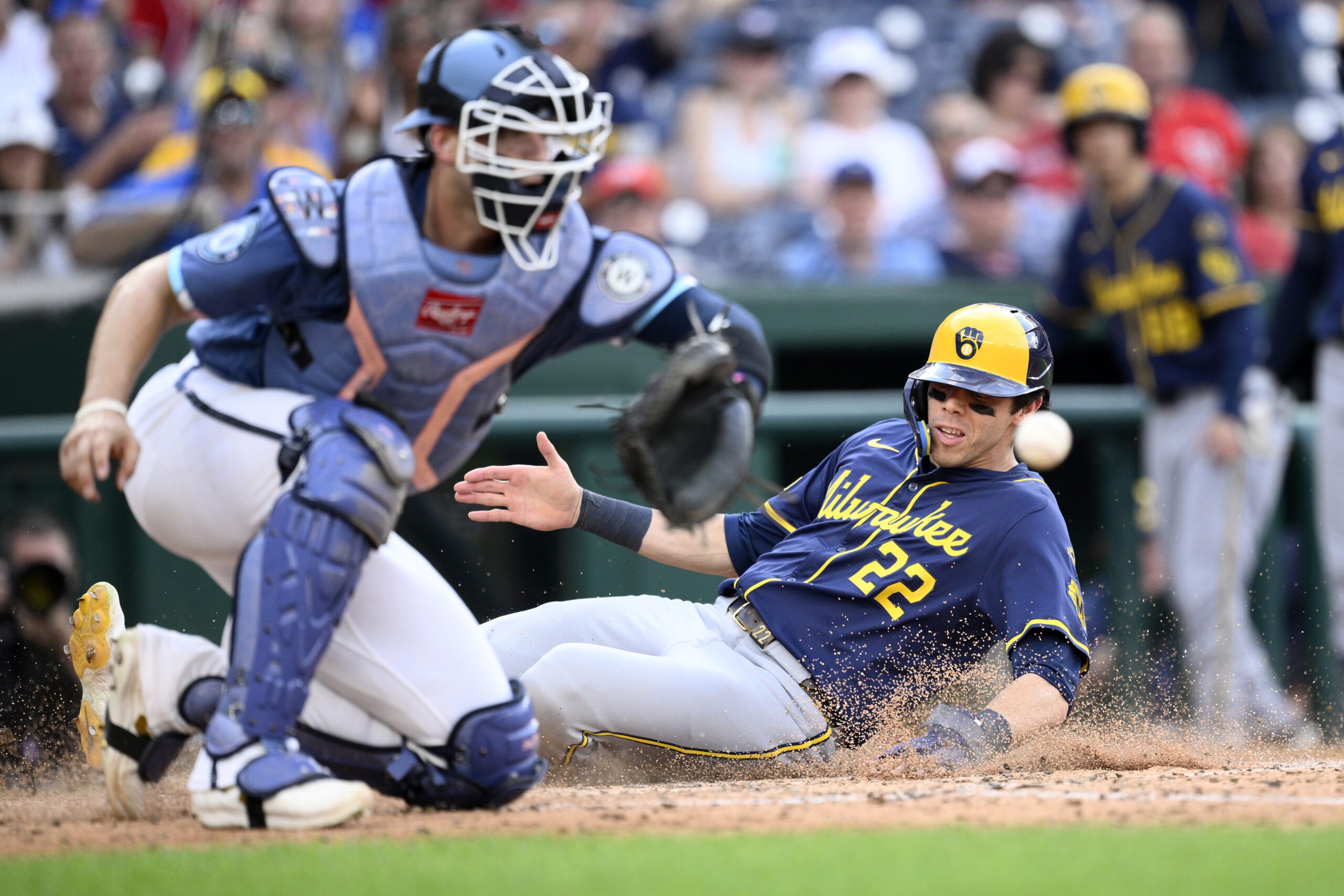 Photo: Christian Yelich (22) slides home to score on a double by Isaac Collins during the ninth inning of a baseball game against Washington Nationals catcher Riley Adams, left, Saturday, Aug. 2, 2025, in Washington. (AP Photo/Nick Wass)