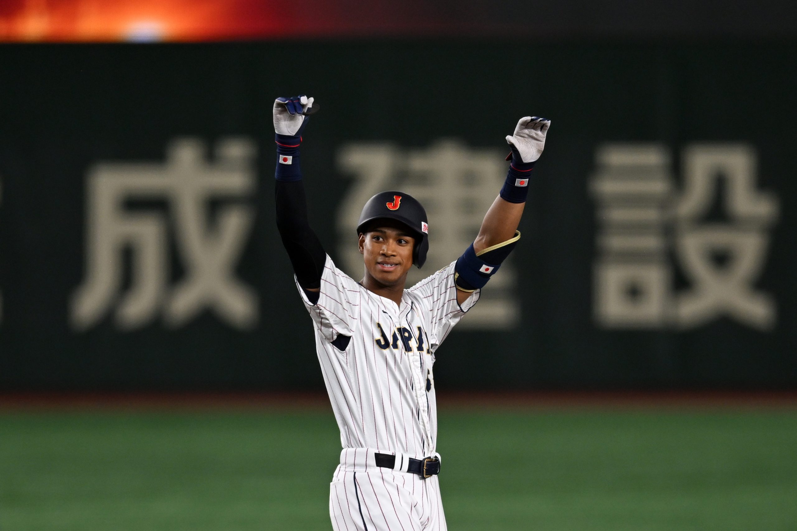 Photo Credit: Outfielder Chusei Mannami #66 of Japan celebrates hitting a double in the 6th inning during the Asia Professional Baseball Championship Final. (Photo by Gene Wang/Getty Images)