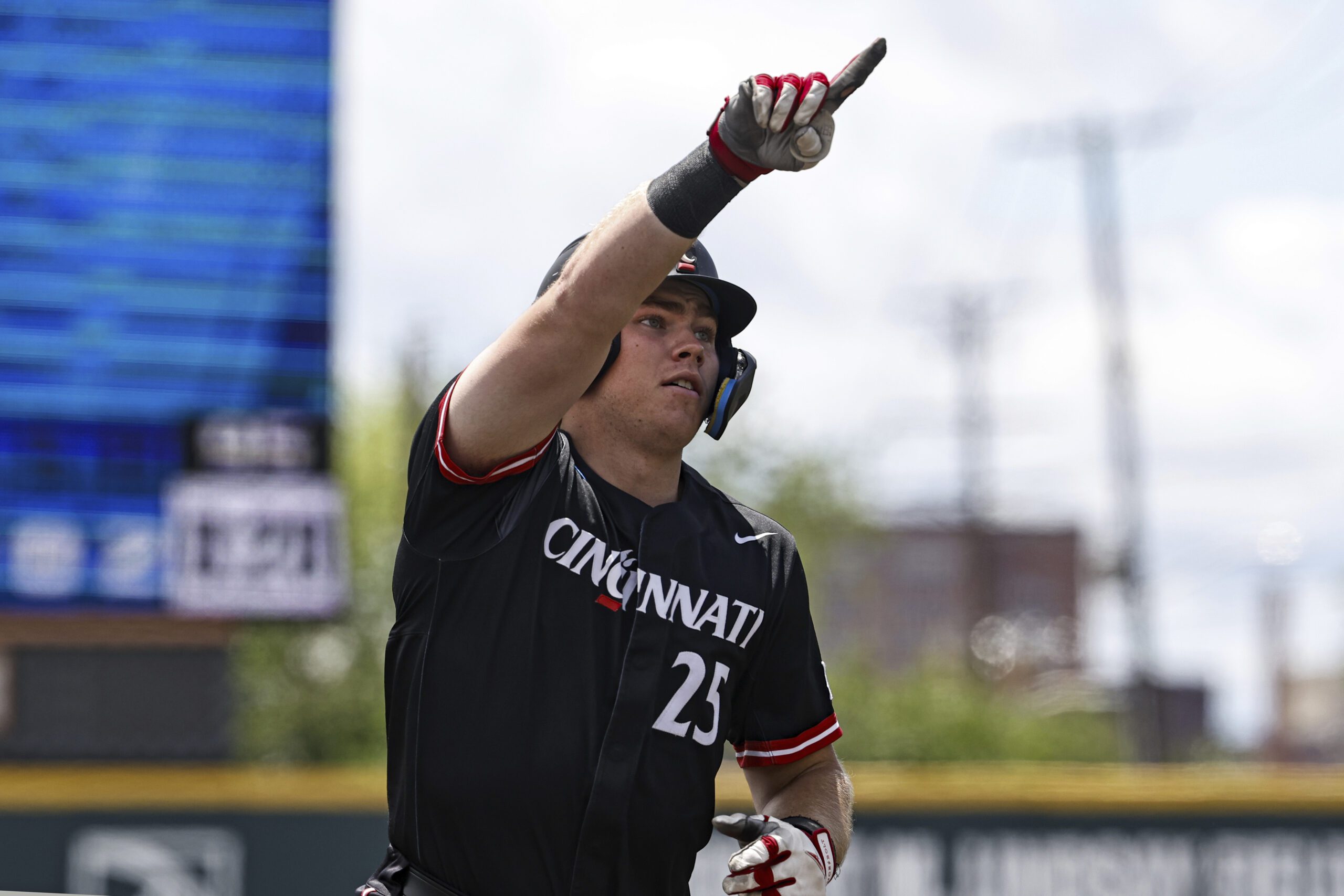 PHOTO: Cincinnati player Quinton Coats (25) gestures to teammates after hitting a homerun during an NCAA baseball game against Wake Forest on Friday, May 30, 2025, in Knoxville, Tenn. (AP Photo/Wade Payne)
