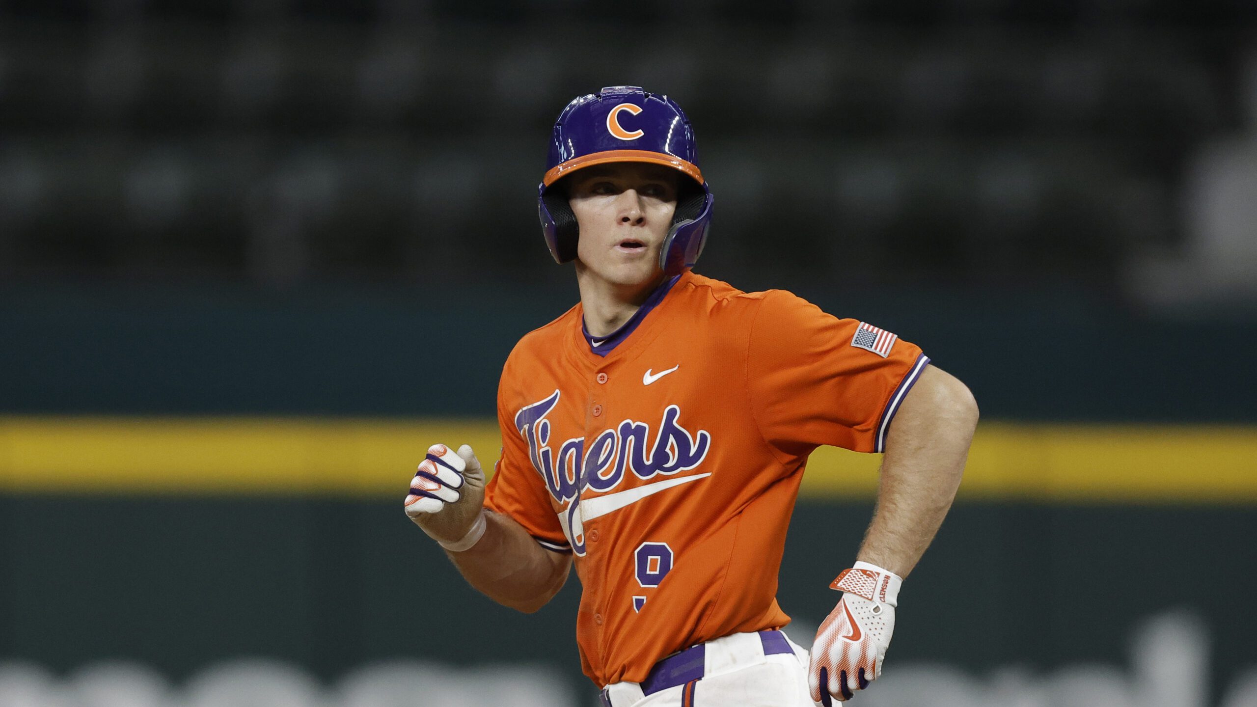PHOTO: Clemson’s Jacob Jarrell (9) runs to second during an NCAA baseball game against Oklahoma State on Friday, Feb. 14, 2025, in Arlington, Texas. (AP Photo/Brandon Wade)