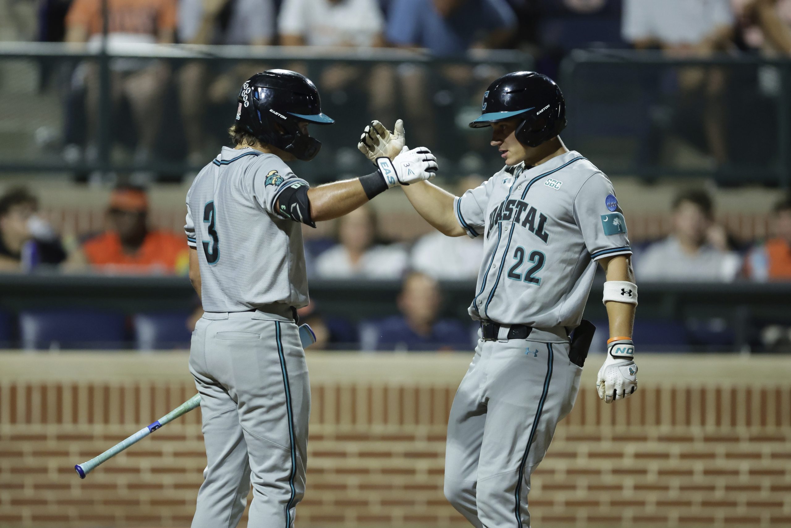 Photo: Coastal Carolina’s Blagen Pado (22) celebrates hitting a solo home run with Ty Dooley (3) during an NCAA super regional baseball game against Auburn on Friday, June 6, 2025 in Auburn, Ala. (AP Photo/Stew Milne)