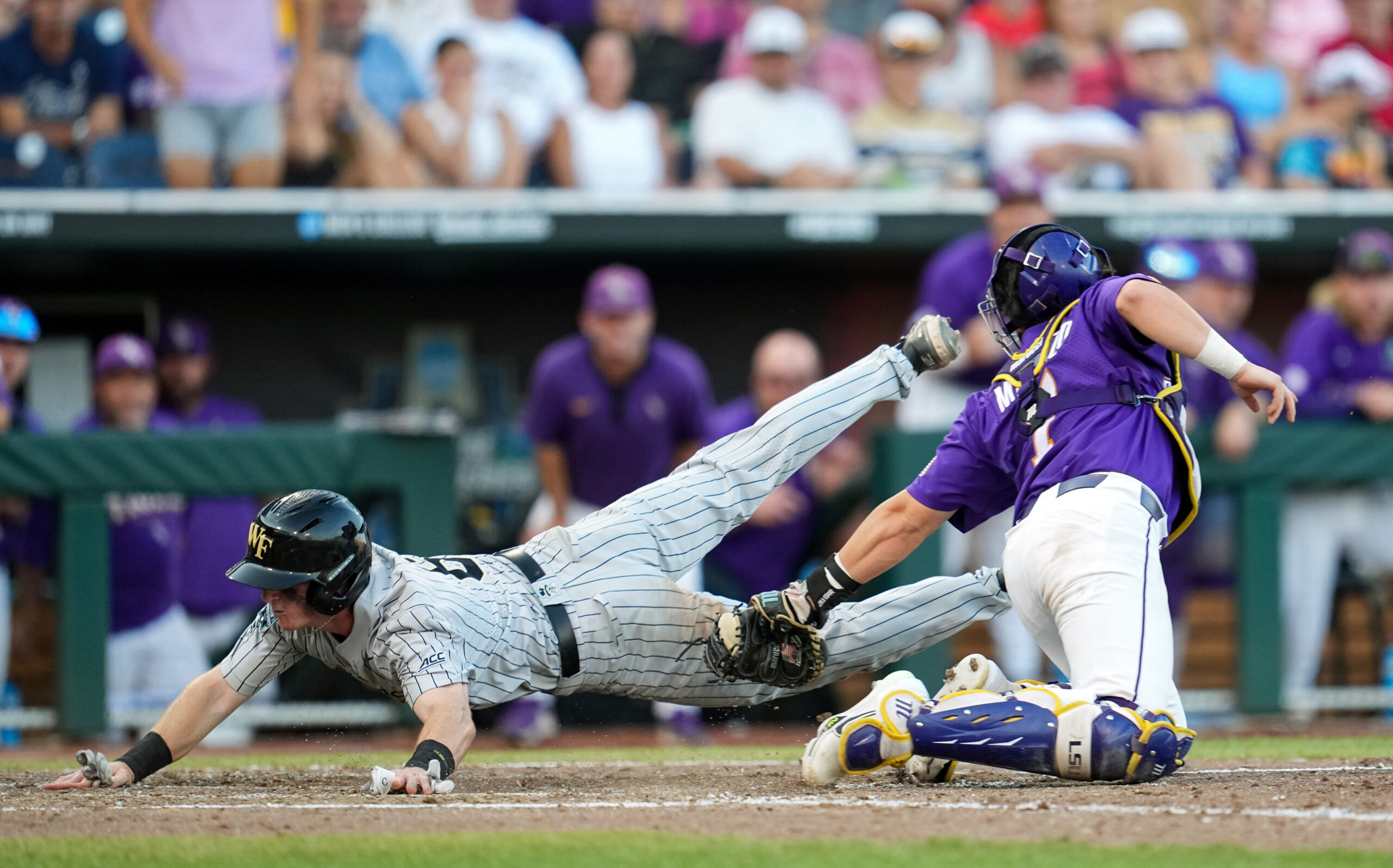 Justin Johnson of the Wake Forest Demon Deacons is tagged out at home by Alex Milazzo of the LSU Tigers during the eighth inning at Charles Schwab Field on June 22, 2023 in Omaha, Nebraska. LSU Tigers defeated Wake Forest Demon Deacons to advance to the NCAA College World Series Finals. (Photo by Jay Biggerstaff/Getty Images)