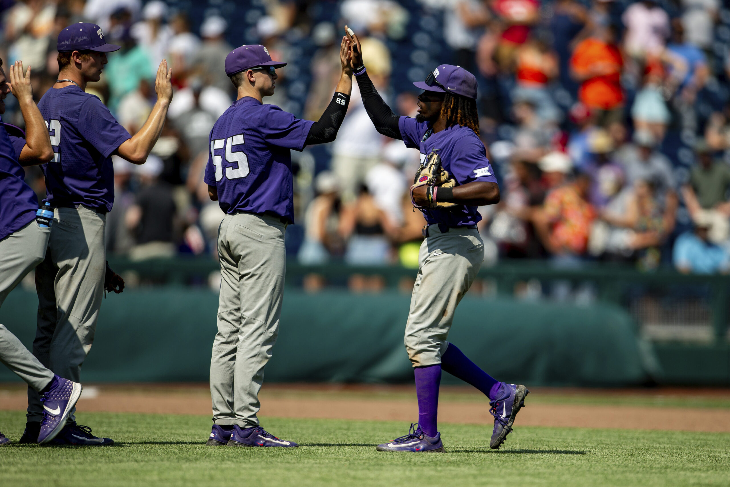 TCU’s Tre Richardson gives TCU infielder Brayden Taylor (55) a high five while celebrating their win over Virginia in a baseball game at the NCAA College World Series in Omaha, Neb., Sunday, June 18, 2023. (AP Photo/John Peterson)