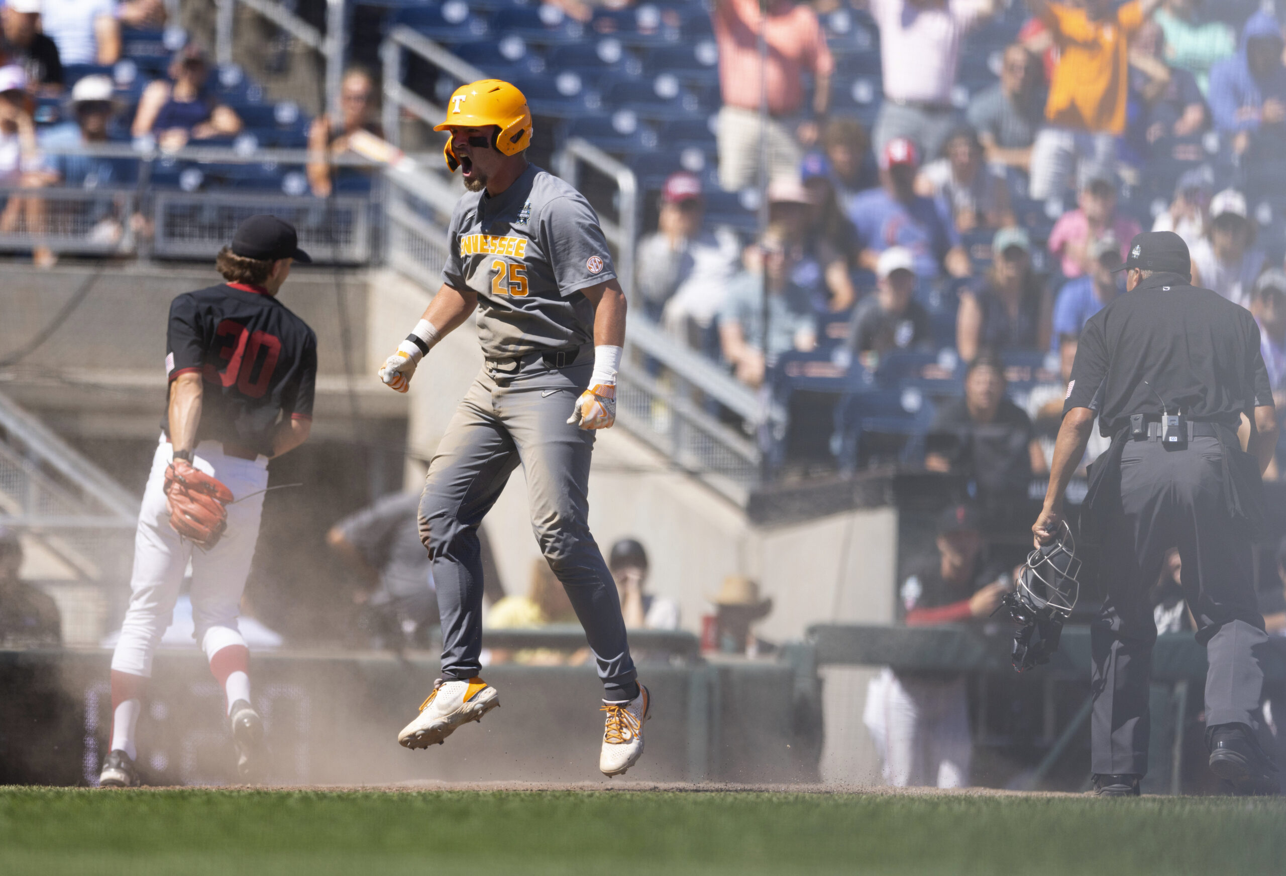 Tennessee’s Blake Burke celebrates after stealing home on a wild pitch against Stanford in the seventh inning of a baseball game at the NCAA College World Series in Omaha, Neb., on Monday, June 19, 2023. Tennessee defeated Stanford 6-4. (AP Photo/Rebecca S. Gratz)