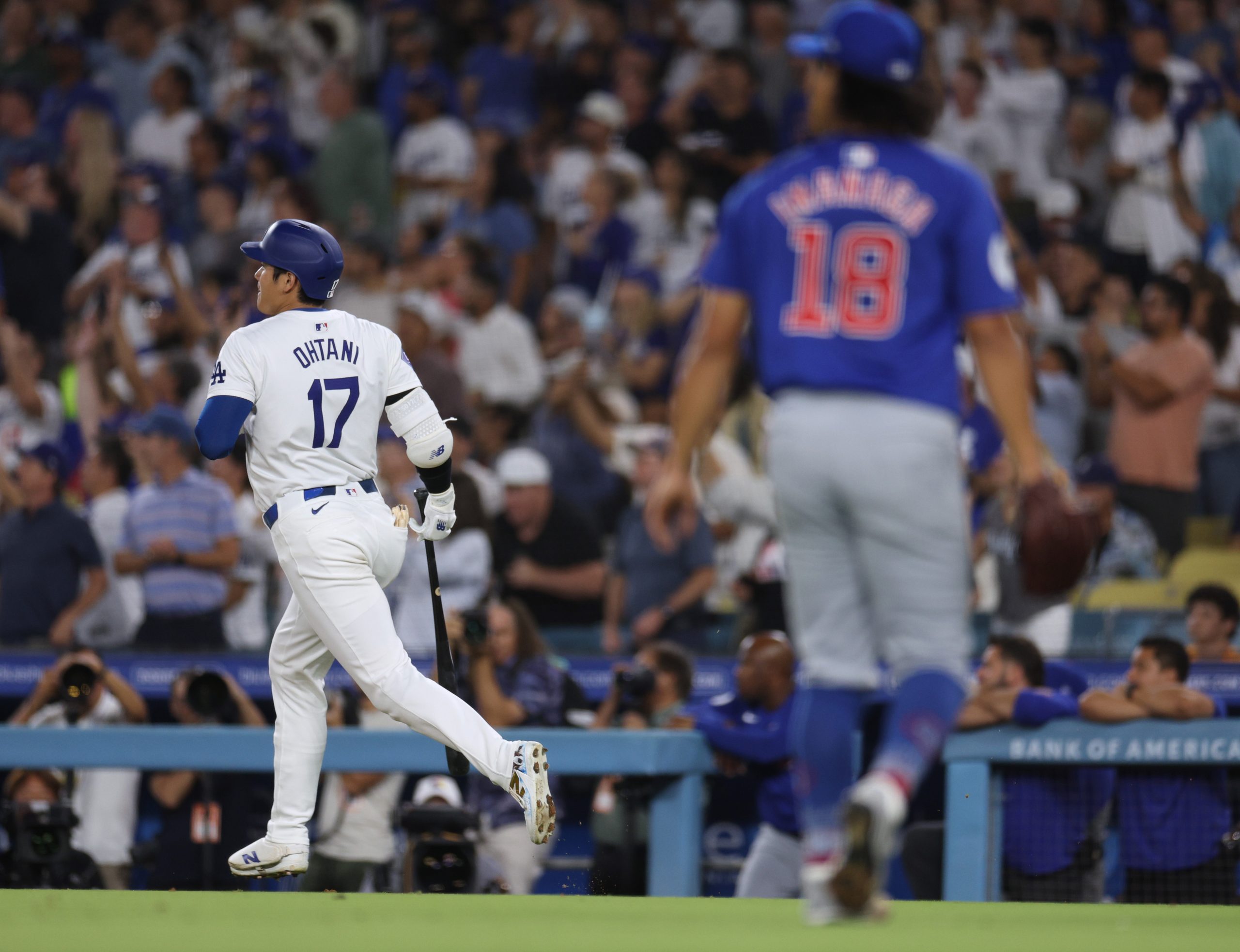 Photo Credit: Shohei Ohtani #17 of the Los Angeles Dodgers watches his fly ball out with Shota Imanaga #18 of the Chicago Cubs during the fifth inning at Dodger Stadium on September 10, 2024 in Los Angeles, California. (Photo by Harry How/Getty Images)