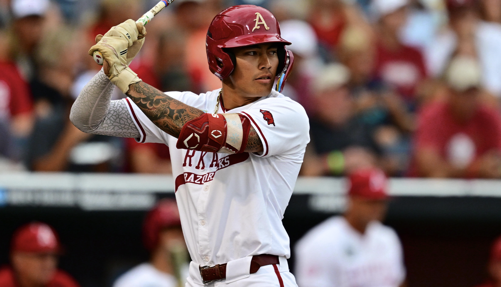 Photo: Southeastern Conference player of the year Wehiwa aloy homered and had an RBI triple in Arkansas’s 7-3 win against UCLA at the College World Series. (Photo Courtesy of Arkansas Baseball)