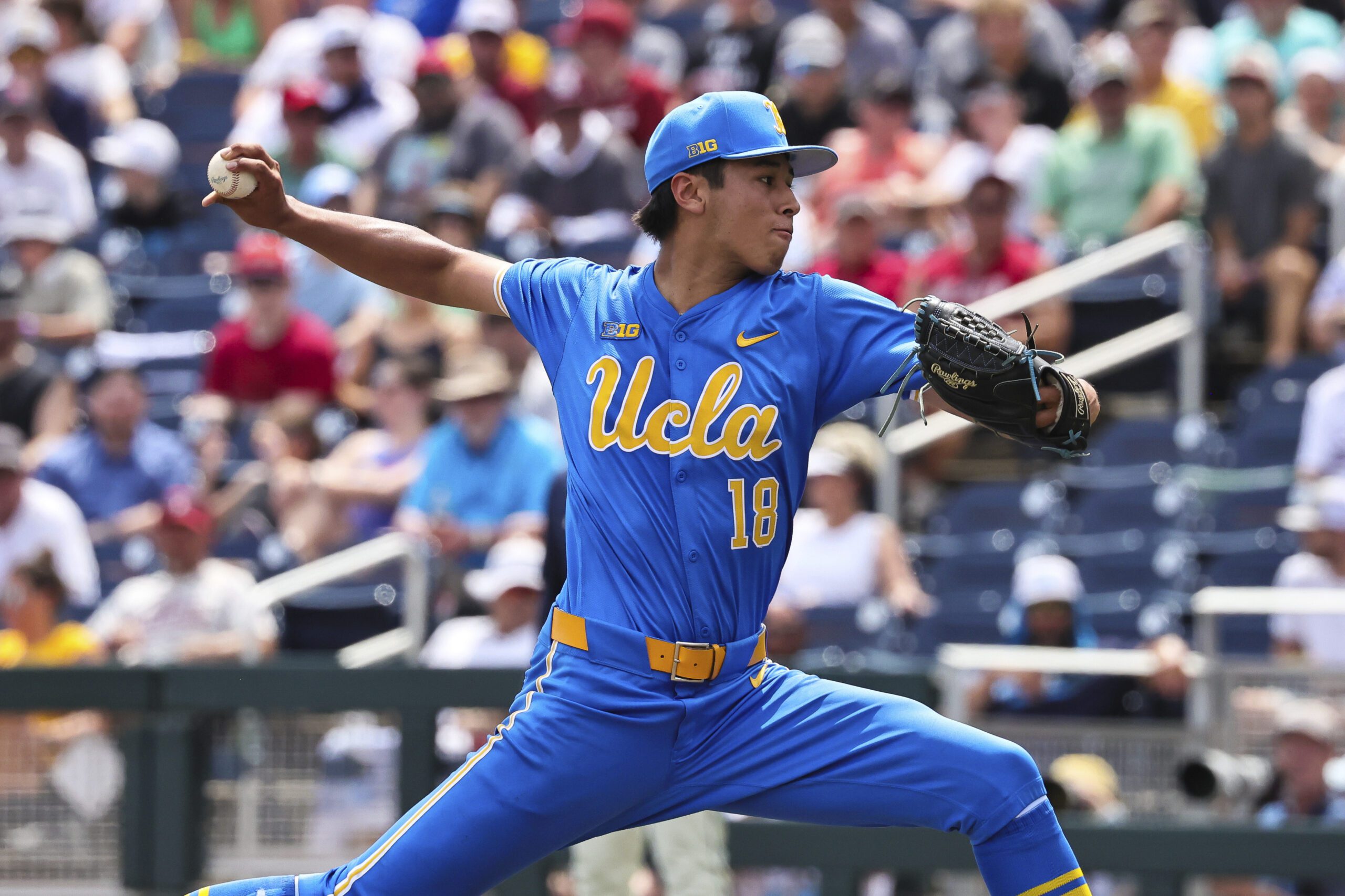 Photo: UCLA pitcher Wylan Moss (18) throws during an NCAA College World Series baseball game against Murray State, Saturday, June 14, 2025, in Omaha, Neb. Moss was one of eight pitchers UCLA used in a game suspended by rain against LSU. (AP Photo/Cory Eads)