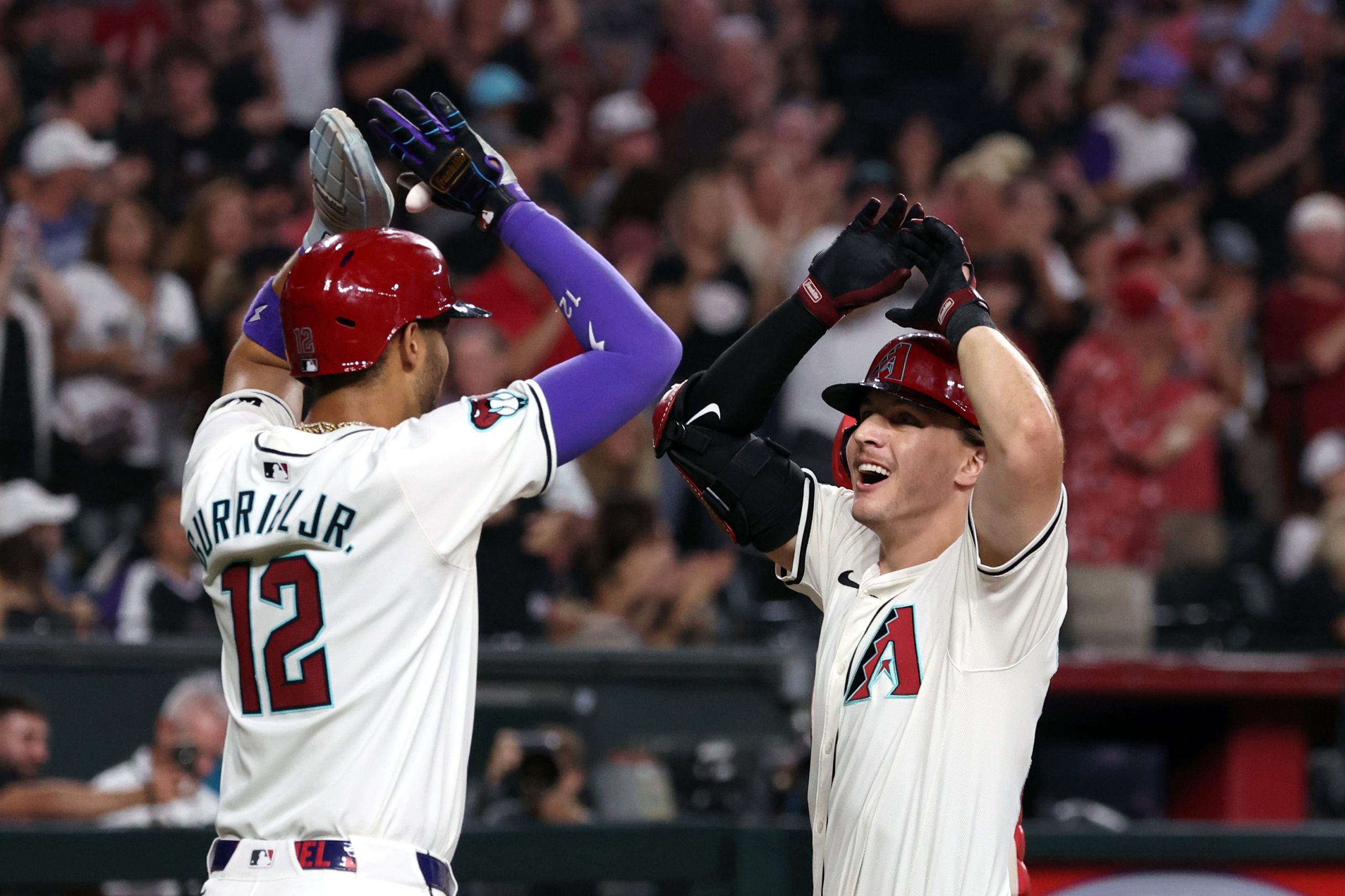 Photo Credit: Jake McCarthy #31 of the Arizona Diamondbacks celebrates with Lourdes Gurriel Jr. #12 after hitting a two run home run during the fifth inning against the Philadelphia Phillies at Chase Field on August 10, 2024 in Phoenix, Arizona. MLB. (Photo by Chris Coduto/Getty Images)