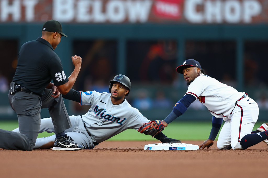 Umpire Jeremie Rehak, left, calls Miami Marlins’ Xavier Edwards, center, out on a steal attempt after a tag was applied by Atlanta Braves second baseman Ozzie Albies in the first inning of a baseball game, Tuesday, April 14, 2026, in Atlanta. (AP Photo/Colin Hubbard)