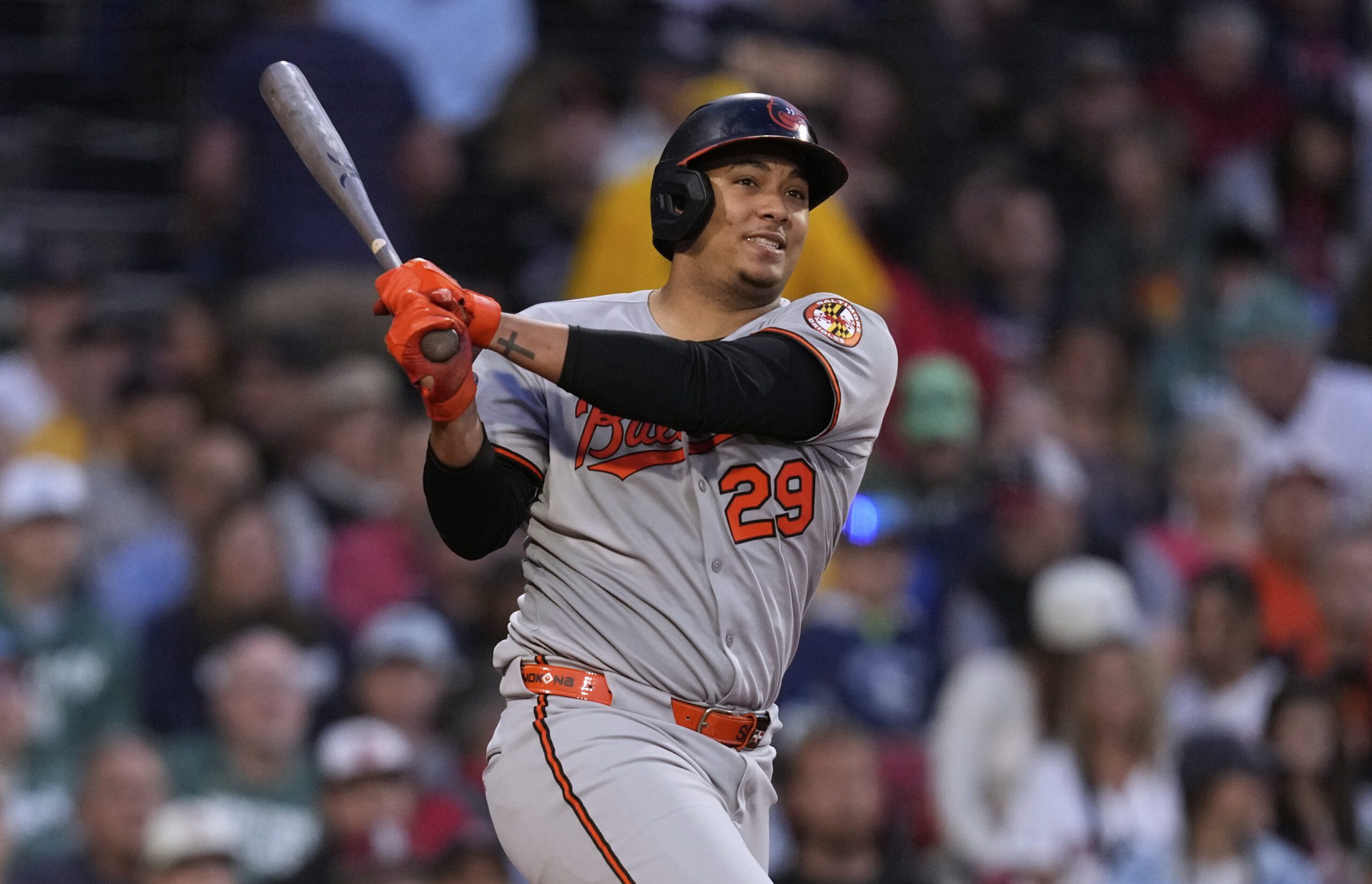 Photo: Samuel Basallo during a baseball game at Fenway Park, Tuesday, Aug. 19, 2025, in Boston. (AP Photo/Charles Krupa)